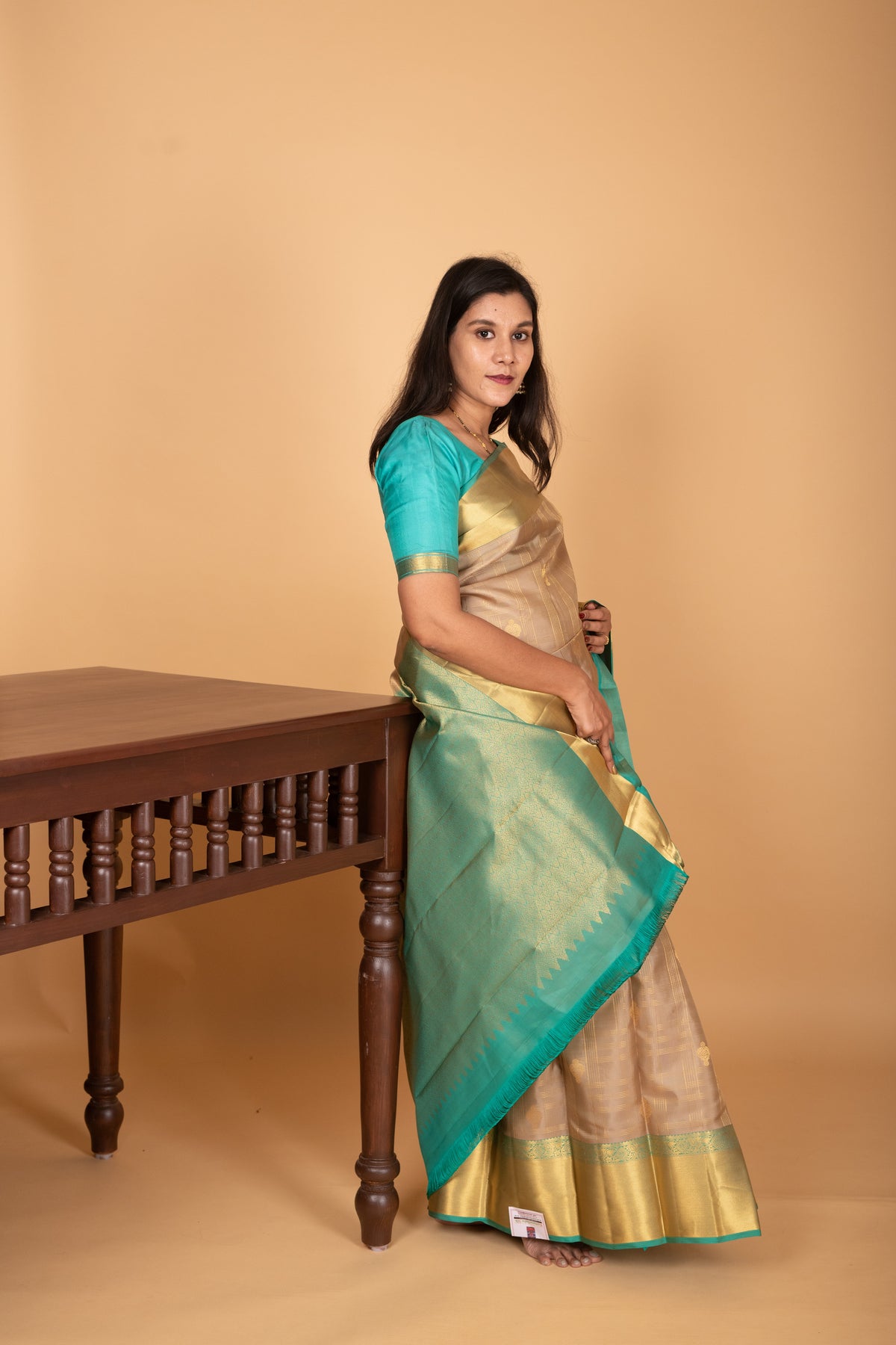 Elegant Checked Body: The neutral beige body is meticulously woven with a traditional checked pattern, accented by golden zari lines that provide a subtle, rhythmic shimmer to the fabric.Ornate Golden Buttas: Within the checked framework, the saree features delicate circular golden zari buttas, adding a layer of classic texture and sophisticated sparkle.Shimmering Dual Tone Blue Border: A striking contrast is provided by the wide Dual Tone Blue border, heavily enriched with opulent golden zari work and traditional geometric motifs.Grand Zari Pallu: The saree concludes with a majestic blue pallu drenched in intricate golden zari patterns, ensuring a royal and high-impact presence at any grand gathering.Premium Kanjivaram Silk: Hand-loomed from 100% Pure Kanjivaram Silk, renowned for its natural luster, superior durability, and the prestigious, heavy drape of an authentic heritage weave.Blouse worn by the model is for styling only last image shown is the actual blouse .