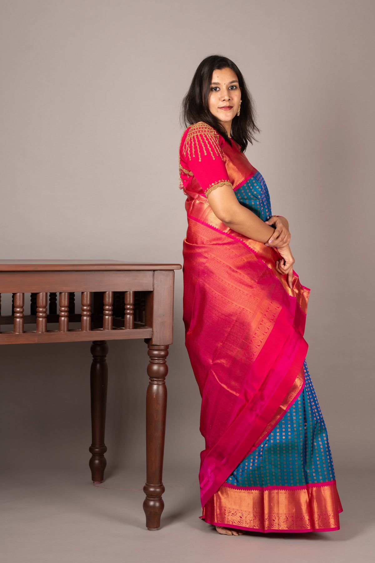 Blue and pink bridal silk saree
