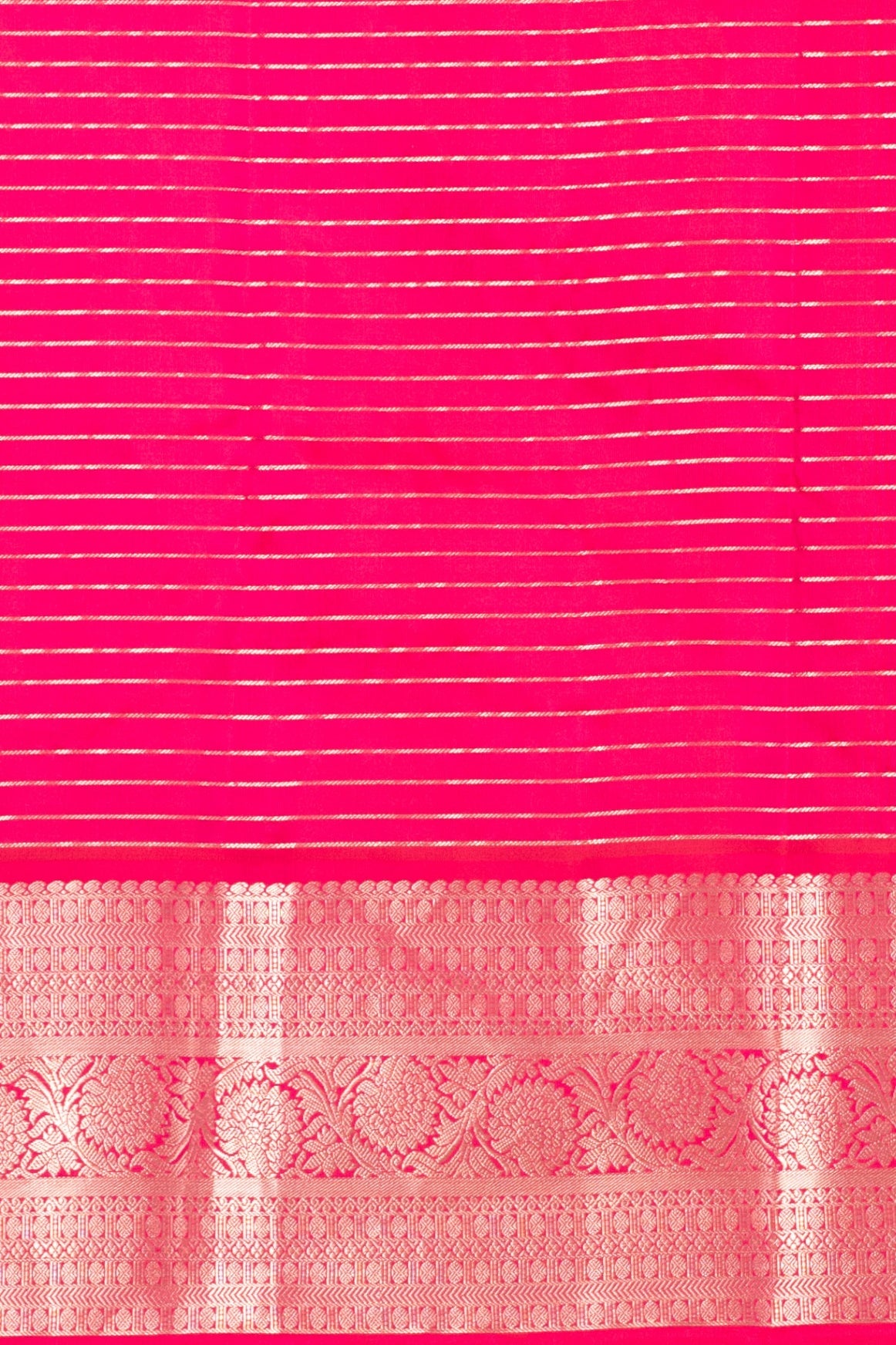 A luminous EggShell White or soft Cream forms the main drape, exuding sophisticated purity. The body is finely woven with a subtle Checked (Kattam) design, lending a beautiful texture and visual depth to the silk. The saree is powerfully framed by a wide, festive Rani Pink (or Fuchsia) border. The pallu (shoulder drape) is equally rich in pink, showcasing dense, elaborate traditional Gold Zari work. The Rani Pink borders feature intricate patterns (often geometric bands and traditional motifs) woven seamlessly in gold zari, creating a magnificent, opulent look.The sharp and clean division between the light, textured body and the dark, vibrant border is achieved using the meticulous Korvai hand-weaving technique, a definitive mark of authentic Kanjivaram craftsmanship. Blouse worn by the model is for styling only last image shown is the actual blouse .