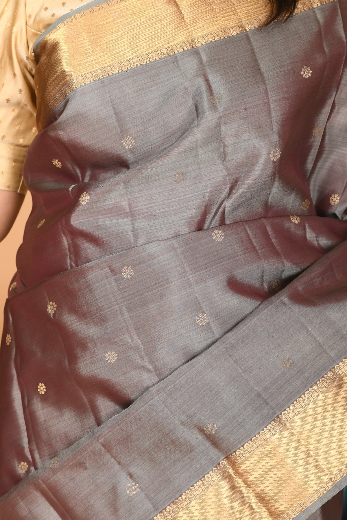 Luminous Steel Grey Body: The main body is crafted in a unique, shimmering steel grey silk that offers a sleek, multi-dimensional luster, shifting beautifully under evening lights.Intricate Golden Buttas: The metallic grey base is elegantly peppered with traditional golden zari buttas, providing a rhythmic sparkle and a rich, textured feel to the smooth silk.Majestic Golden Zari Border: A wide, regal border in brilliant gold provides a high-contrast frame, enriched with traditional woven patterns and horizontal zari bands.Grand Zari Pallu: The saree concludes with an opulent golden pallu drenched in dense, traditional zari work, ensuring a royal presence from every angle. Blouse worn by the model is for styling only last image shown is the actual blouse .