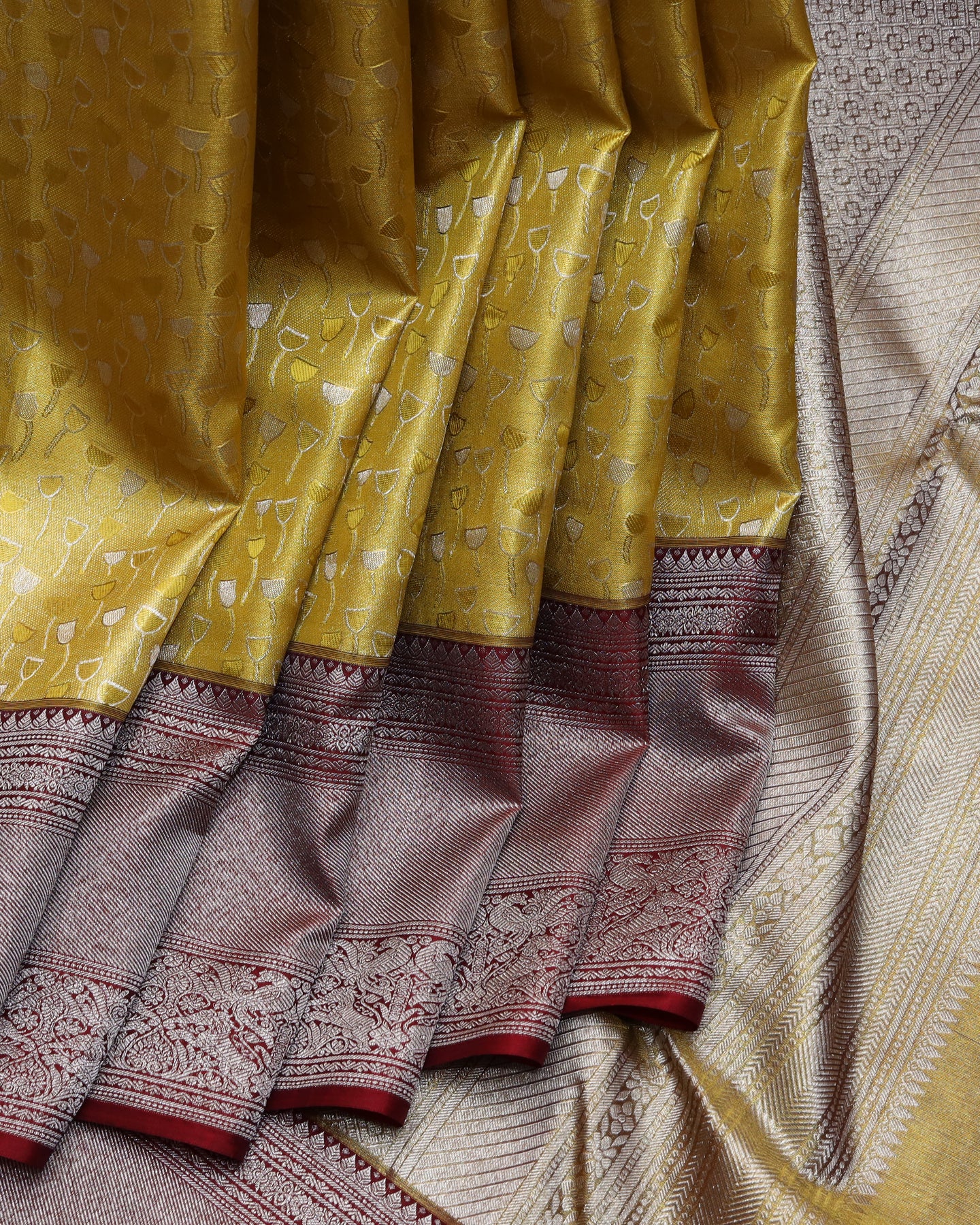 This is an elegant golden  yellow and silver silk saree, featuring a unique scattered leaf motif pattern in silver zari across the body, adding a subtle yet modern touch. The contrasting border in deep maroon is intricately woven with delicate floral and paisley designs, highlighted by fine silver detailing, creating a striking visual contrast. The pallu is richly adorned with a complex pattern of geometric lines and floral vines, adding depth and sophistication, making this saree an excellent choice for weddings, festive occasions, and grand celebrations.Blouse is shown in the last image