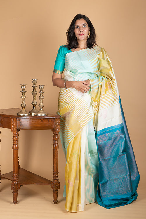 Experience a harmonious blend of subtle charm and traditional opulence with this unique pastel striped Kanchipuram silk saree. The body of the saree features delicate stripes in soft hues of off-white, pale yellow, and a hint of mint green, creating a visually appealing and contemporary texture.