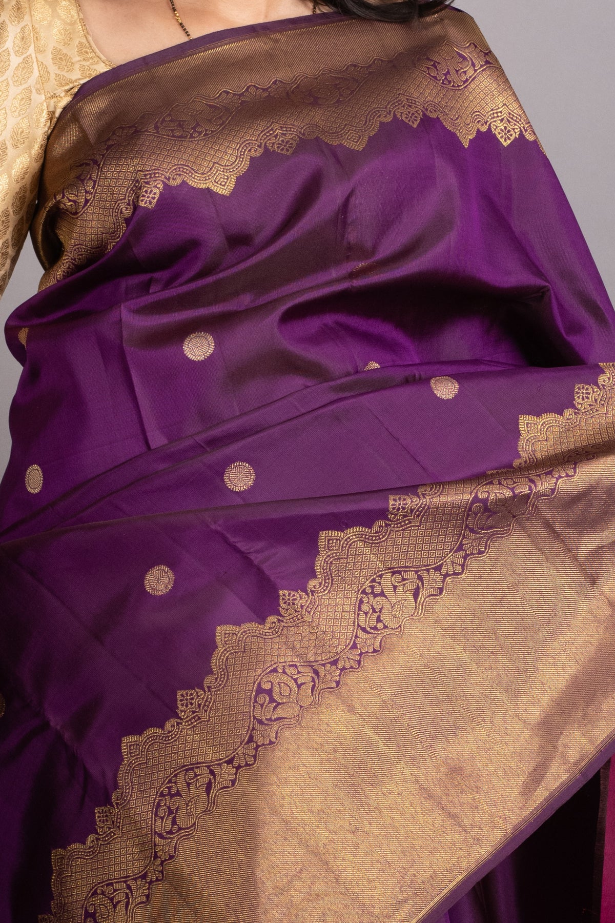 The body of the saree is a rich, opulent Violet a color historically associated with royalty and luxury. This intense, luminous hue is dramatically complemented by the expansive, lustrous Antique Gold border and pallu.Crafted from 100% Pure Kanjivaram Silk, the saree is characterized by its superior weight, smooth drape, and rich natural sheen, a hallmark of authentic Kanchipuram weaving.