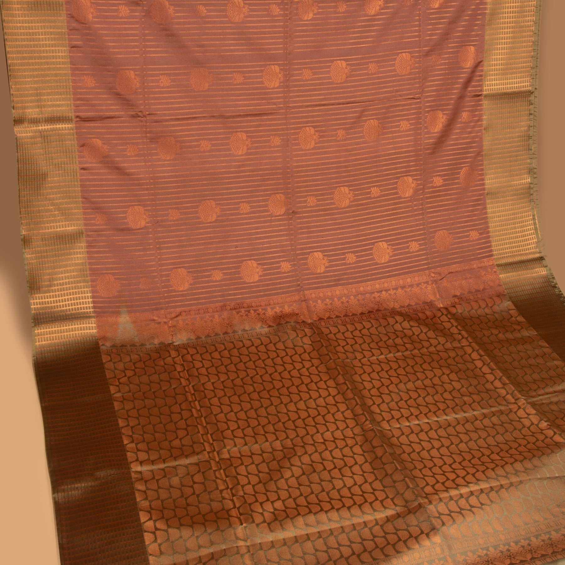 The Coral Pink body is enriched with meticulous zari patterns. It features alternating horizontal stripes: some are fine and textured, while others are interspersed with large, eye-catching woven circular or 'Butta' motifs.The pallu is the defining feature, rendered in the rich Tea Green/Bronze color. It boasts a complex, all-over brocade weave with a distinct geometric or repeating scale-like pattern, giving it an opulent texture and a heavy, graceful fall.