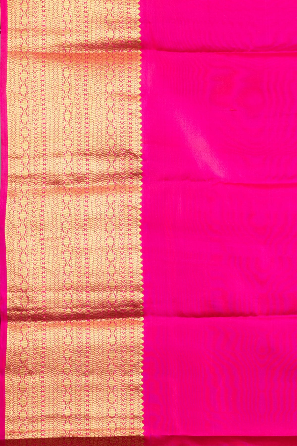 Pure Kanjivaram Silk, offering a splendid texture, a crisp fall, and a brilliant sheen that catches the light beautifully.The main field of the saree boasts a smooth, uniform weave, allowing the richness of the silk and the striking contrast borders to take center stage.