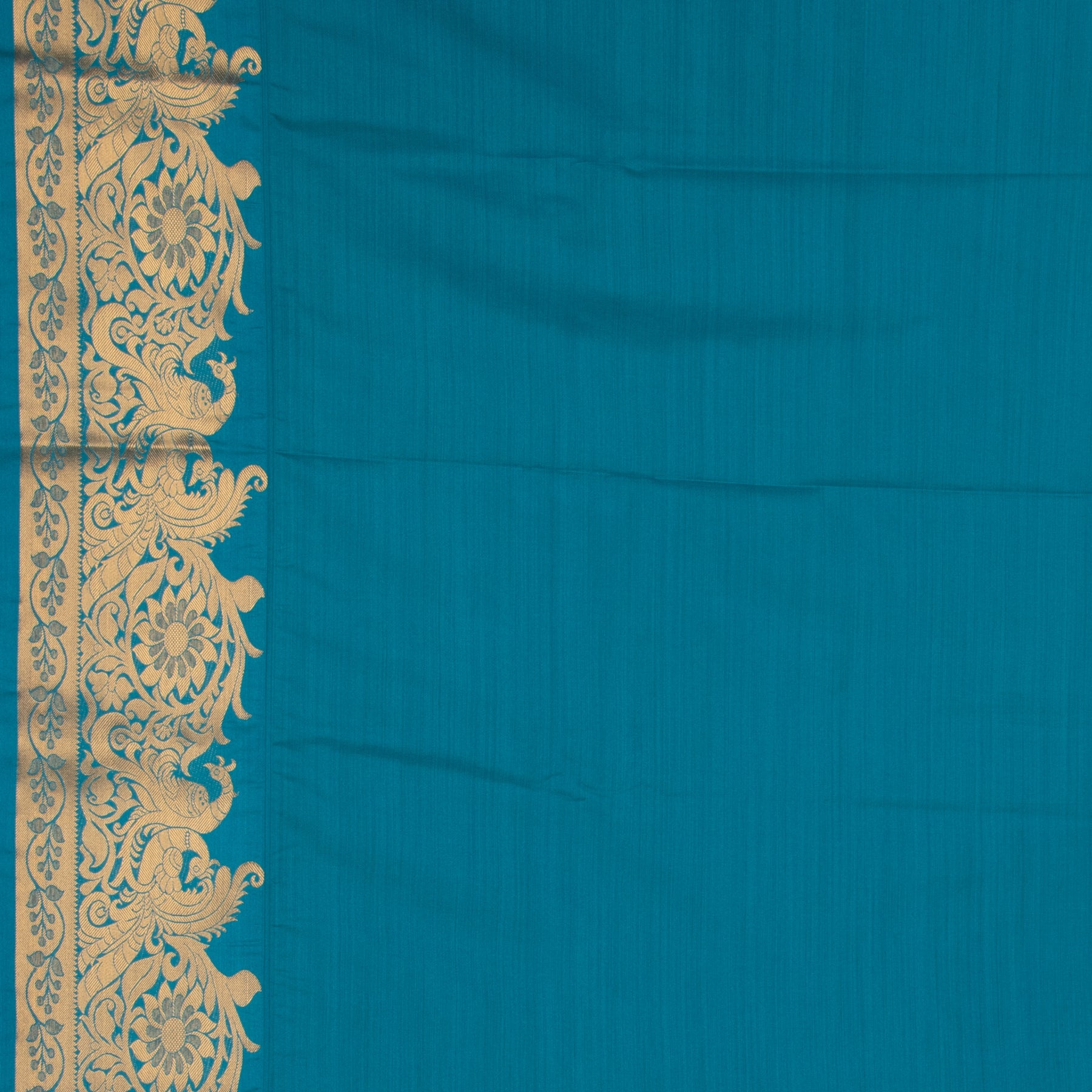 A deep, vibrant Dark Violet forms the main body. The color is highly saturated and glows richly under the light.The wide contrast border is a striking Teal (or Peacock Blue/Emerald Green), which provides a lively and stunning complement to the violet body.The saree is a Semi Silk offering the luxurious look and excellent drape of silk with added comfort and ease of maintenance.