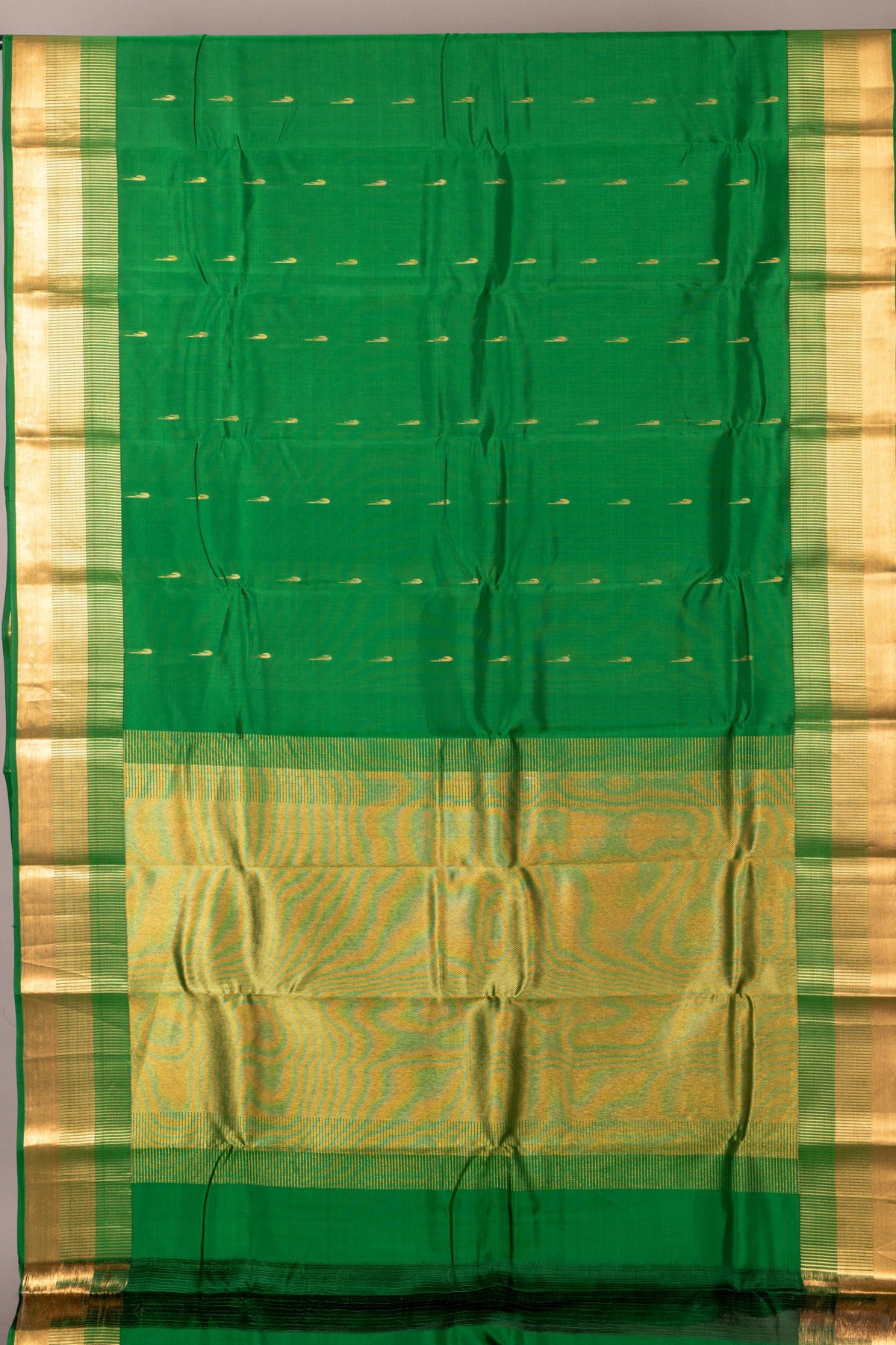 Exude elegance and grace with this stunning green pure touch silk saree, a true testament to timeless beauty and refined craftsmanship. The rich emerald green body is delicately adorned with subtle golden motifs, creating a look that’s both regal and understated.The saree is accentuated with a striking golden zari border and pallu, featuring vertical stripe designs that add a structured contrast to the smooth flow of the body. Crafted from high-quality pure touch silk, this saree drapes beautifully and offers a luxurious feel, making it a perfect pick for traditional occasions or formal gatherings.