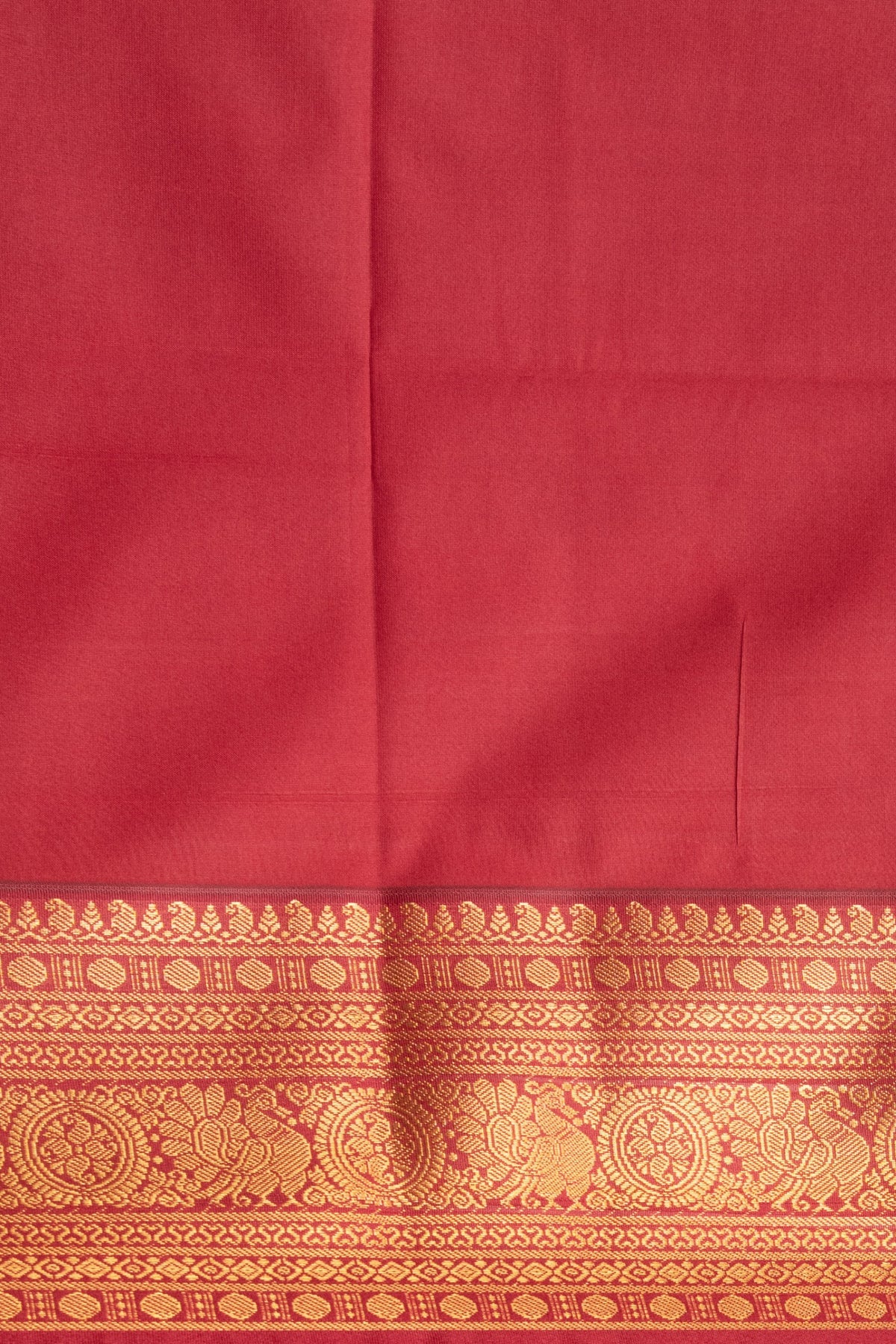 A sophisticated Grey-Green. The body features a beautifully intricate, all-over Gold Zari check pattern (Kattam), with delicate woven Buttas (motifs) placed within the squares, giving it a luminous texture. A striking, traditional Blood Red that provides a powerful and auspicious contrast.The Red border is heavily and magnificently woven with dense Gold Zari. It features traditional patterns, including prominent Peacock (Mayil) and ornate circular motifs, symbolizing prosperity and beauty.The border is framed by smaller bands of geometric Zari weaving, showcasing the precision of Kanchi craftsmanship. Kanchi Soft Silk, known for its light weight, smooth texture, and elegant drape, offering the regal look of silk with enhanced comfort for all-day wear. Last image shown is the blouse.