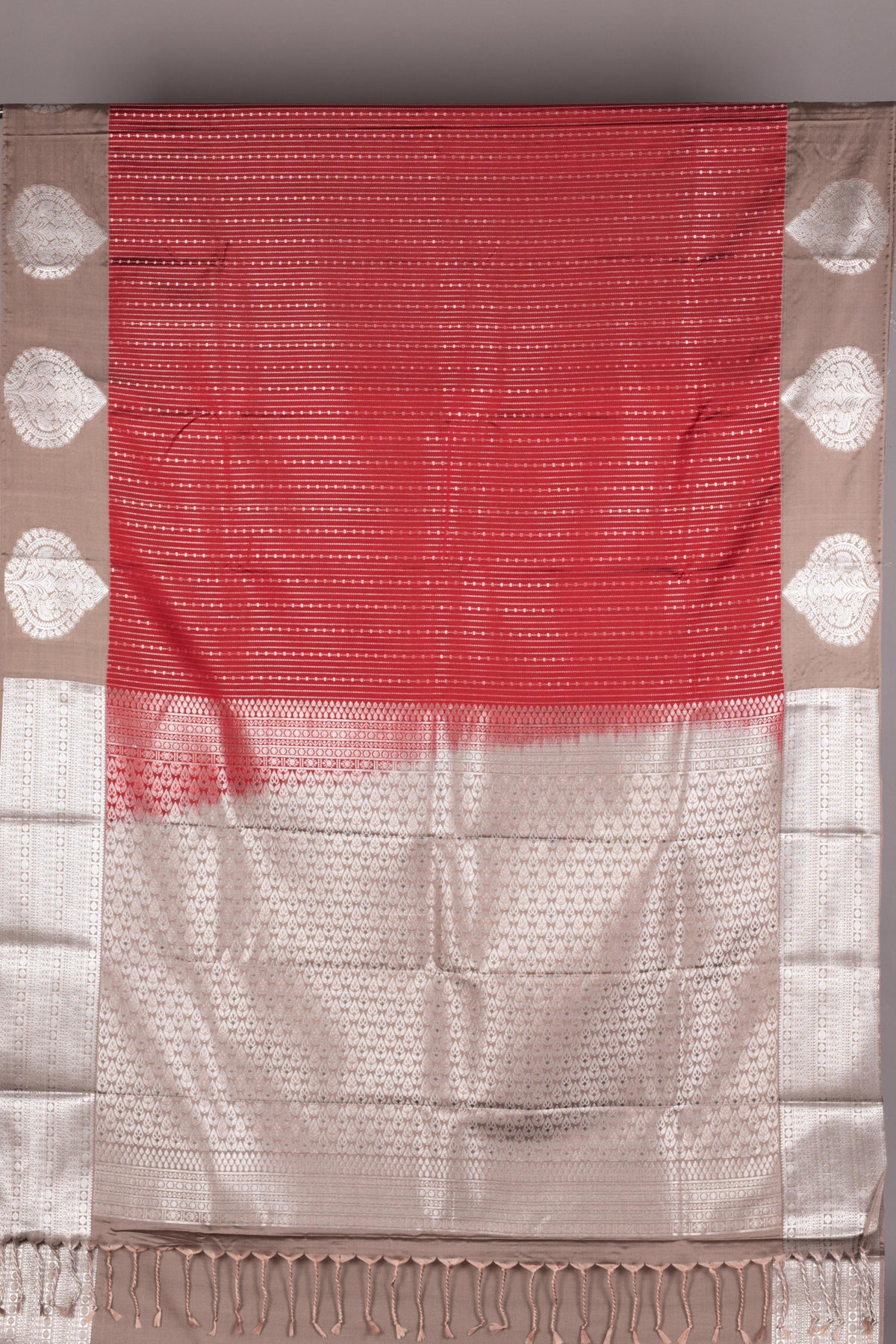 The maroon section is adorned with delicate vertical silver zari stripes, adding a refined shimmer. The beige pallu features intricate silver zari motifs in a classic paisley and floral pattern, enhancing its traditional appeal.
