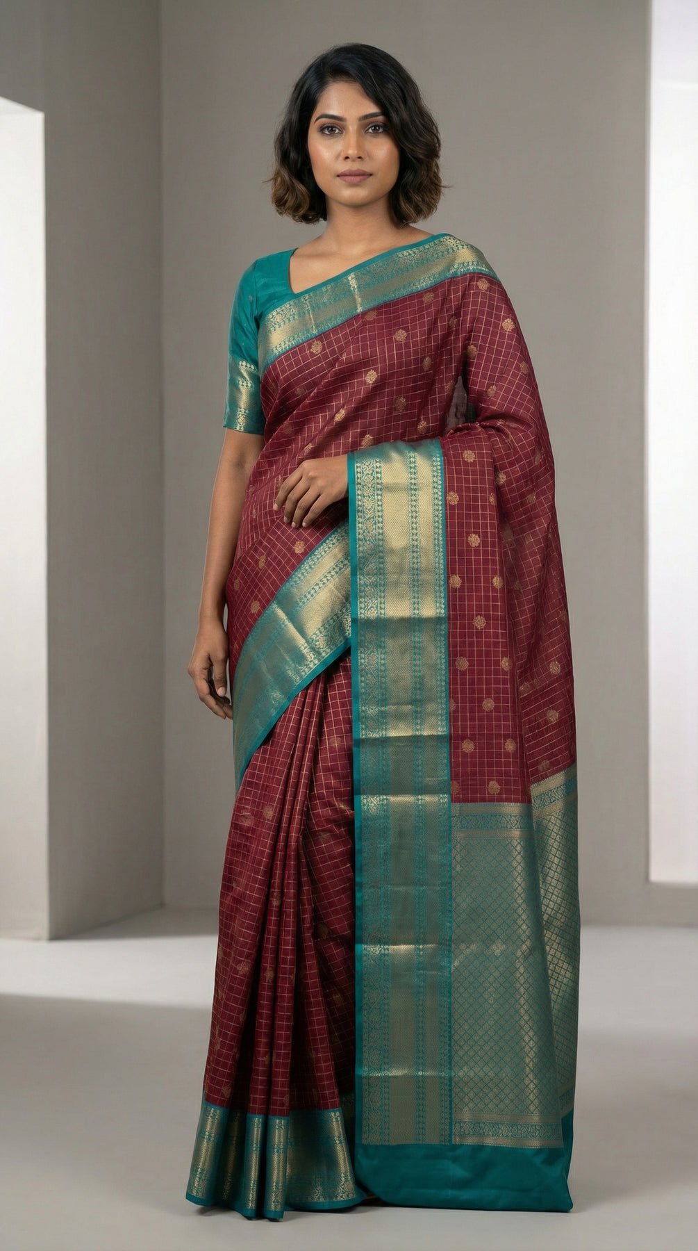 The Maroon field is intricately woven with a fine all-over gold zari checkered pattern (or grid). Small, delicate gold-toned buttis are placed within the checks, lending a rich, shimmering texture to the main fabric.The wide Teal Green border features prominent silver-toned zari bands with intricate traditional motifs, providing a clear, structured frame that beautifully defines the saree's edges.The magnificent Teal Green pallu is densely woven with a detailed diamond mesh or fine checkered zari pattern. This dense work ensures a heavy, opulent fall and a dazzling, uniform luster.