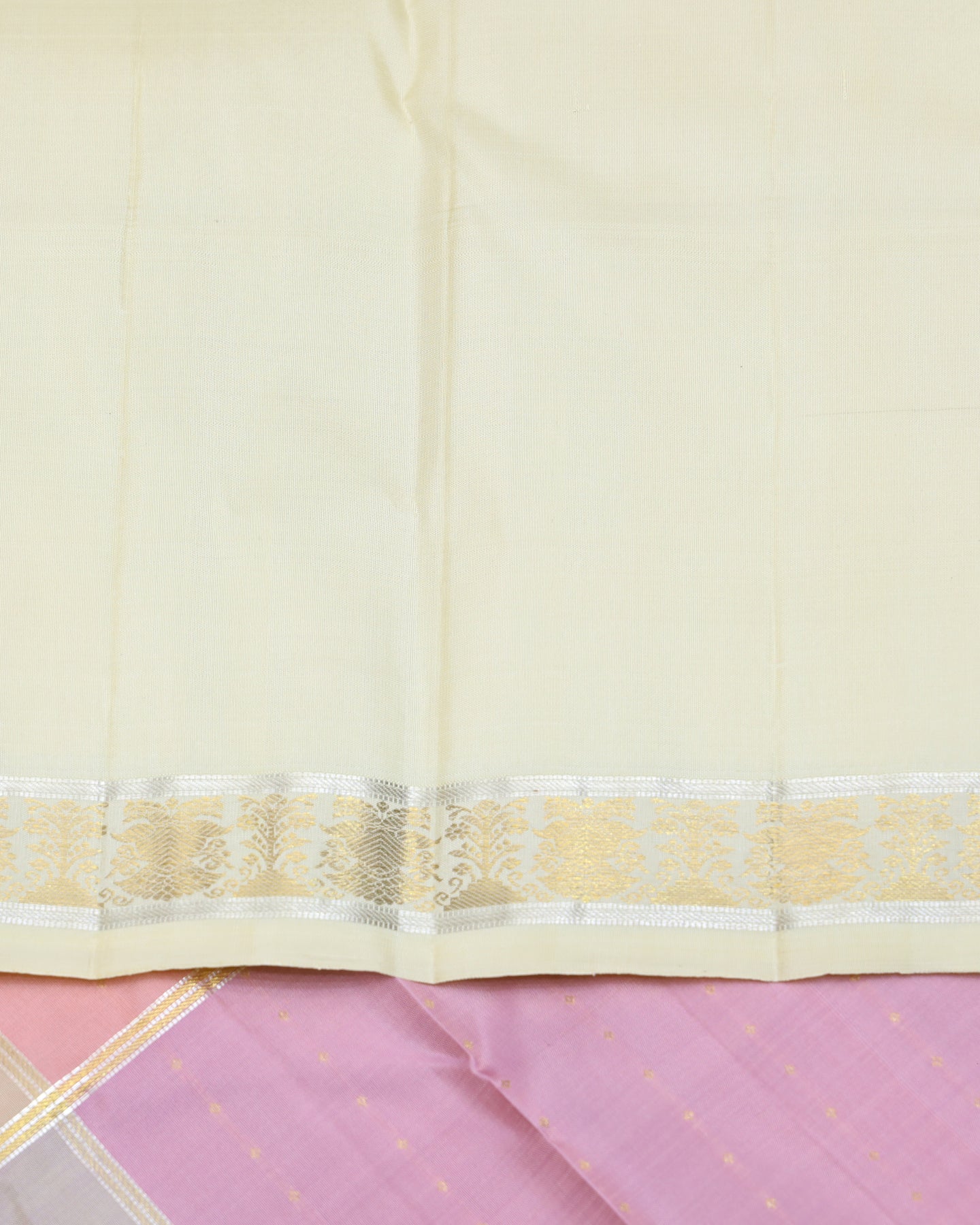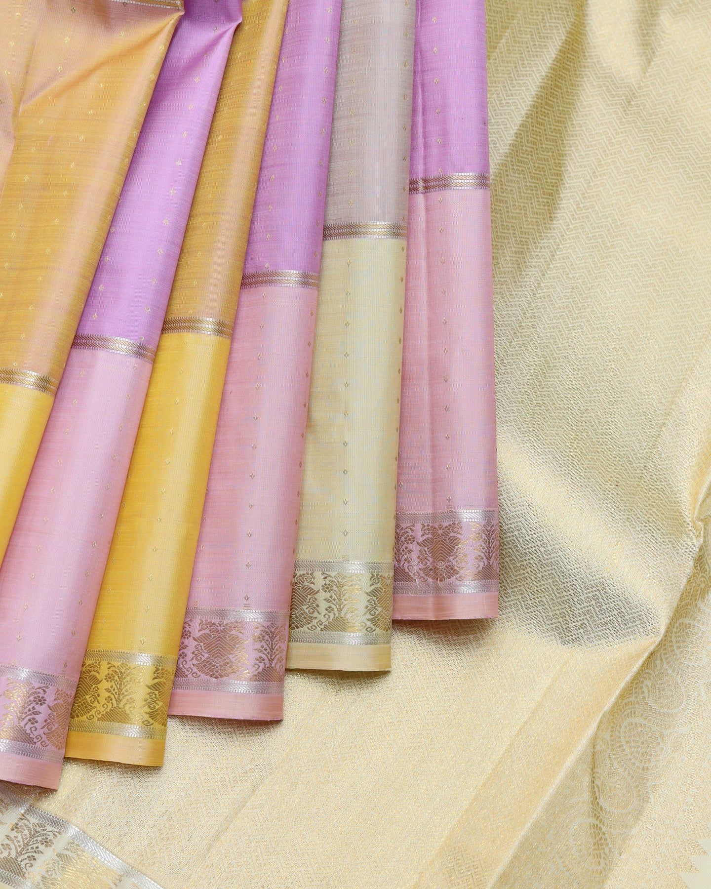 This saree features a delightful blend of pastel shades, transitioning smoothly from soft lavender to pale yellow, creating a mesmerizing ombre effect. The body is adorned with delicate, gold zari buttas, adding a touch of elegance without overpowering the gentle color palette. The border is subtly detailed with intricate floral and paisley motifs in silver zari, perfectly complementing the overall tone of the saree. The pallu, with its finely woven zari patterns, enhances the ethereal beauty of this drape, making it ideal for daytime celebrations and elegant gatherings.Blouse is shown in the last image