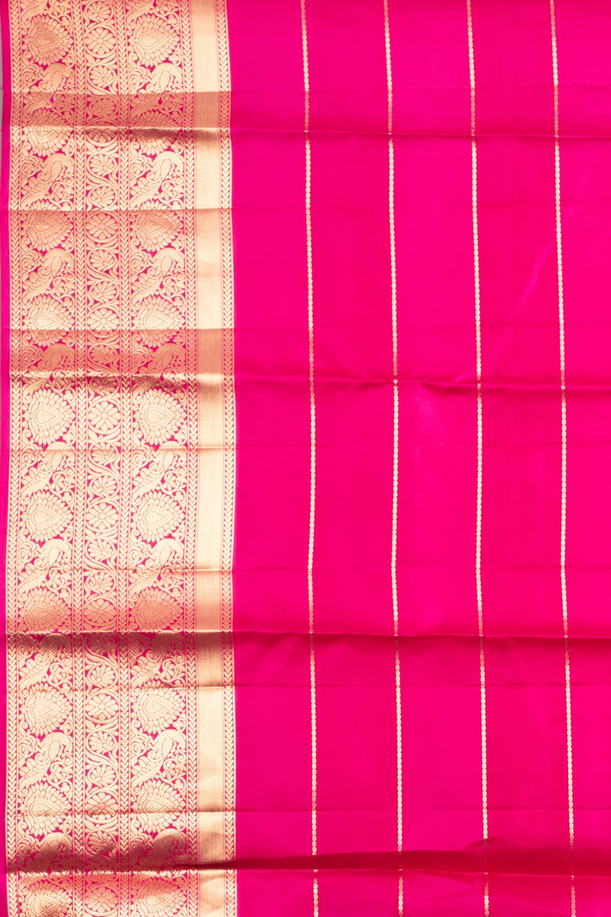 Pure Kanjivaram Silk, prized for its opulent weight, durability, and intense natural sheen, ensuring a luxurious and statuesque drape.The body features elegant, evenly placed gold zari buttas (motifs), possibly in a traditional floral or coin design, shimmering subtly against the dark blue silk.The grand, expansive Rani Pink pallu is richly embellished with dense gold zari weaving, showcasing elaborate traditional motifs like paisleys, creepers, or temple designs.
