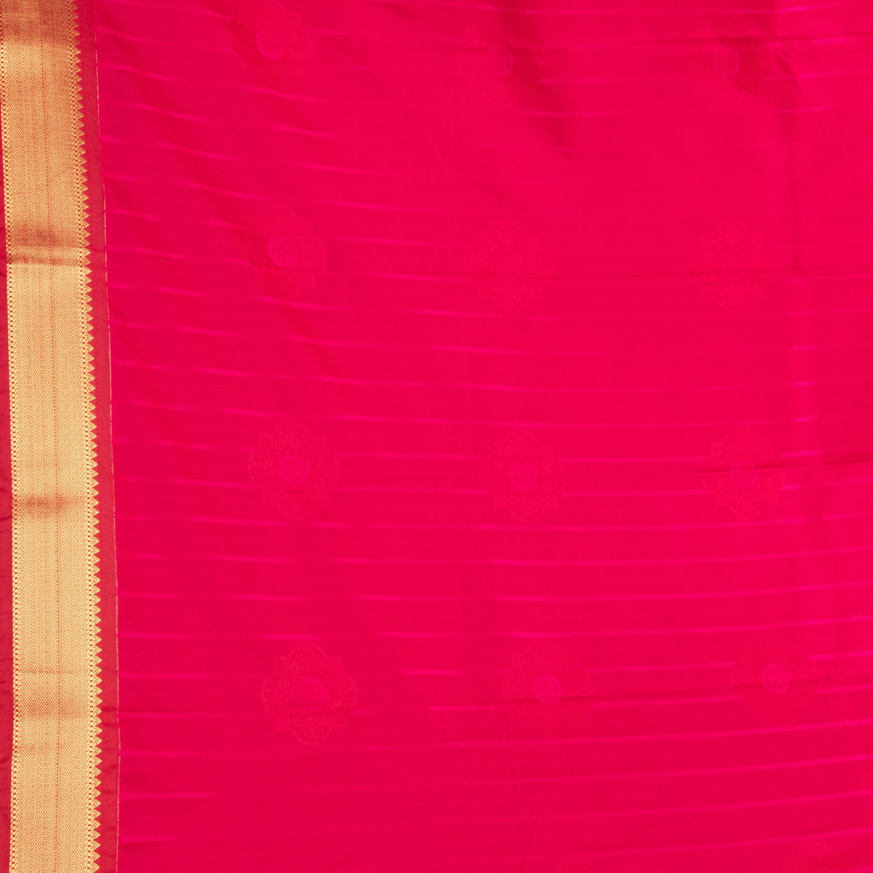The Off White field is adorned with delicate, evenly spaced small gold-toned zari buttis (motifs) that shimmer subtly against the light base, offering a refined texture without overwhelming the simplicity.The striking Red border is richly woven with traditional gold zari patterns, likely featuring geometric or ornamental motifs, creating a clear and commanding frame for the saree.The magnificent Red pallu is the statement piece, featuring dense, intricate zari weaving that showcases large, elaborate traditional motifs—possibly paisleys, florals, or geometric bands—lending a heavy, luxurious drape.