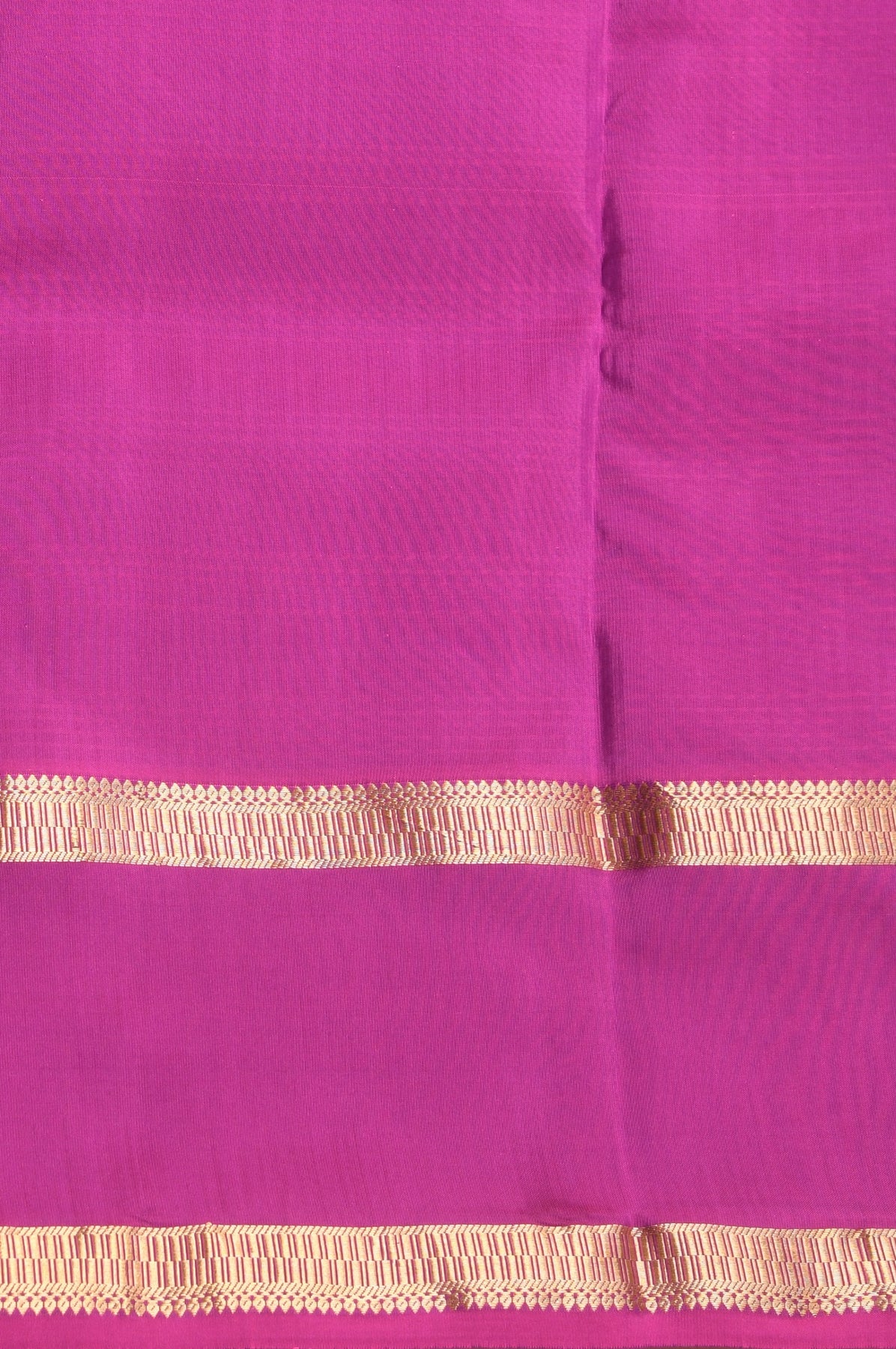 Body: A captivating Peacock Green base intricately woven with a fine checked pattern in contrasting purple threads, giving the fabric a dimensional and iridescent look.Border: A clean, bold Magenta-Purple border that frames the saree perfectly. It is accented with slim Gold Zari pinstripes for a touch of metallic elegance.Pallu: A grand display of traditional artistry, featuring a rich Gold Zari weave on a magenta-purple base. The design includes a stunning temple-style geometric transition (motive) where the body meets the pallu. Last image shown is the blouse.