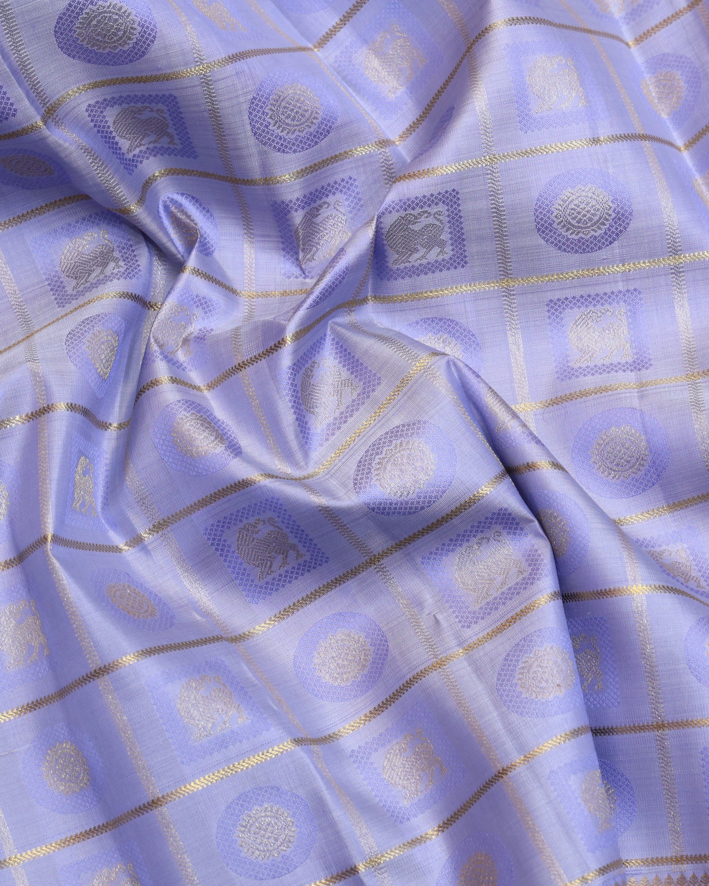 This saree exudes a serene and ethereal charm with its light lavender base, beautifully complemented by intricate silver and gold zari motifs arranged in a structured grid pattern across the body. The motifs feature alternating circular and traditional designs, bordered by fine zari lines that add a touch of elegance. The border is a standout, showcasing a rich interplay of gold zari with intricate paisley and floral patterns, enhancing the saree's regal appeal. The pallu is richly woven with elaborate detailing, adding a grand finish, making this saree an ideal choice for special occasions and celebrations.Blouse is shown in the last image