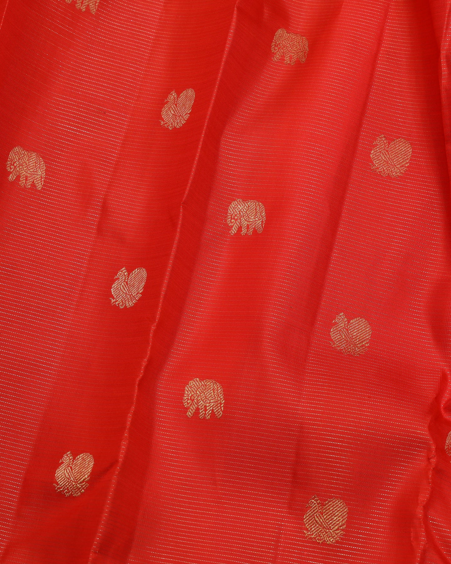 This striking saree showcases a vibrant red body adorned with intricately woven gold elephant motifs, symbolizing strength and royalty. The border is a captivating Lavender with rich golden zari work, featuring traditional paisley and floral designs, adding a touch of regality. The pallu carries forward this grand design with elaborate patterns, enhancing the saree's overall allure. This exquisite combination of bold red and majestic lavender, accentuated with fine gold detailing, makes it an ideal choice for weddings, festive occasions, and grand celebrations.Blouse is shown in the last image