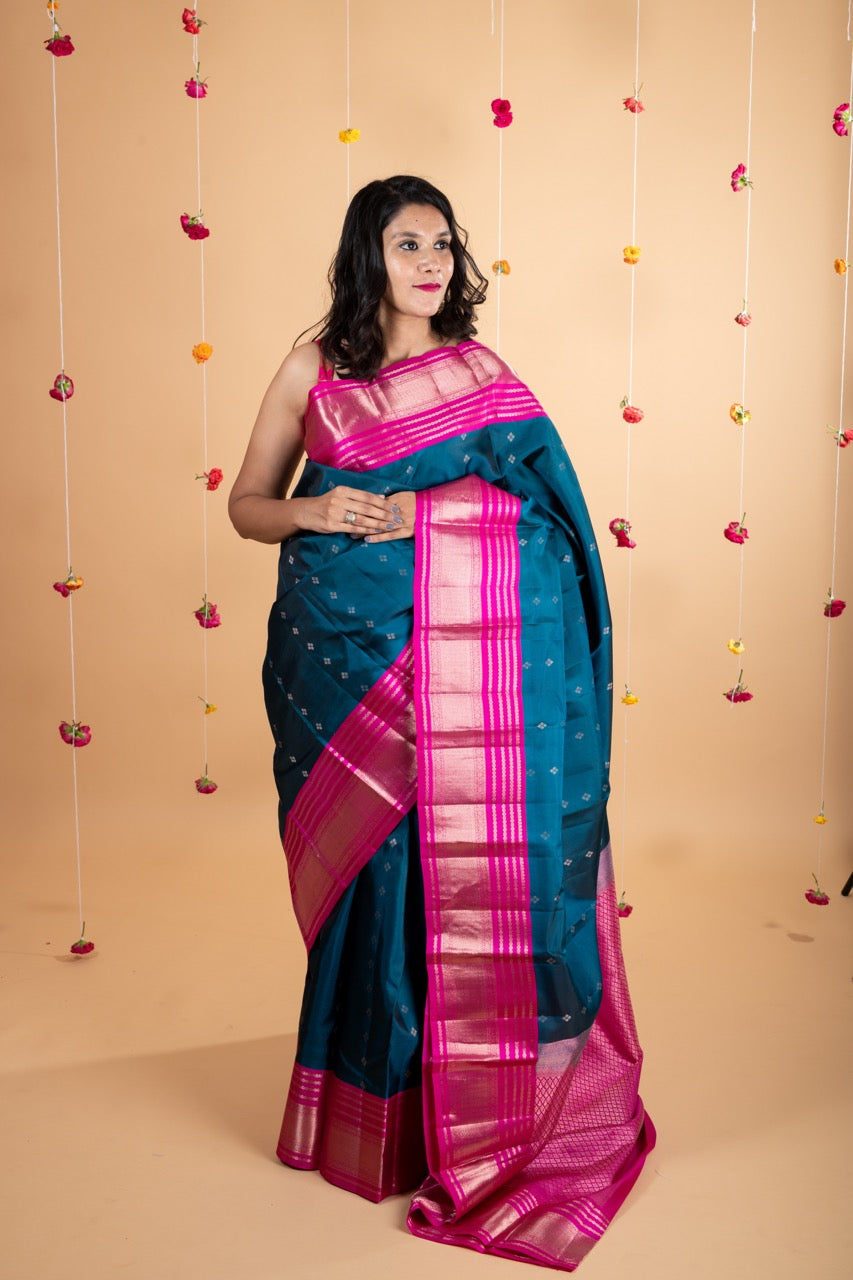 Teal blue pure silk saree