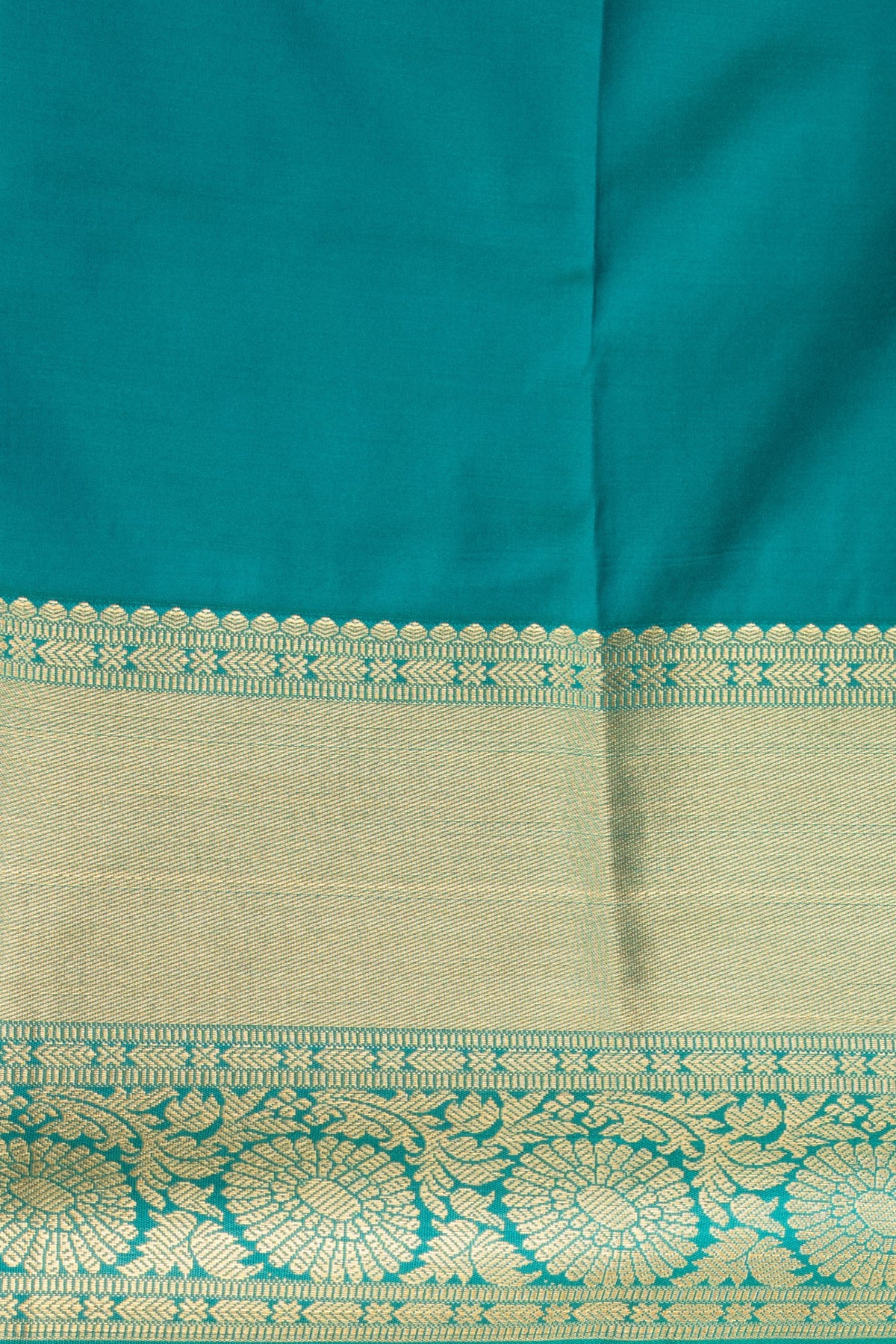 A deep, regal Violet that exudes sophistication. The body is elegantly detailed with traditional Gold Zari Buttas (motifs) and small woven squares near the border. A striking, wide border in vibrant Teal Green which shimmers dramatically against the dark violet. The Teal Green border is richly decorated with magnificent Gold Zari weaving.It features a large central band of geometric and stylized patterns.The lower edge is adorned with an elaborate band of traditional large floral/paisley motifs, showcasing classic Kanjivaram artistry.Kanchi Semi Silk, offering a beautiful, structured drape and a luxurious sheen while ensuring comfort and manageability for all-day wear. Last image shown is the blouse.