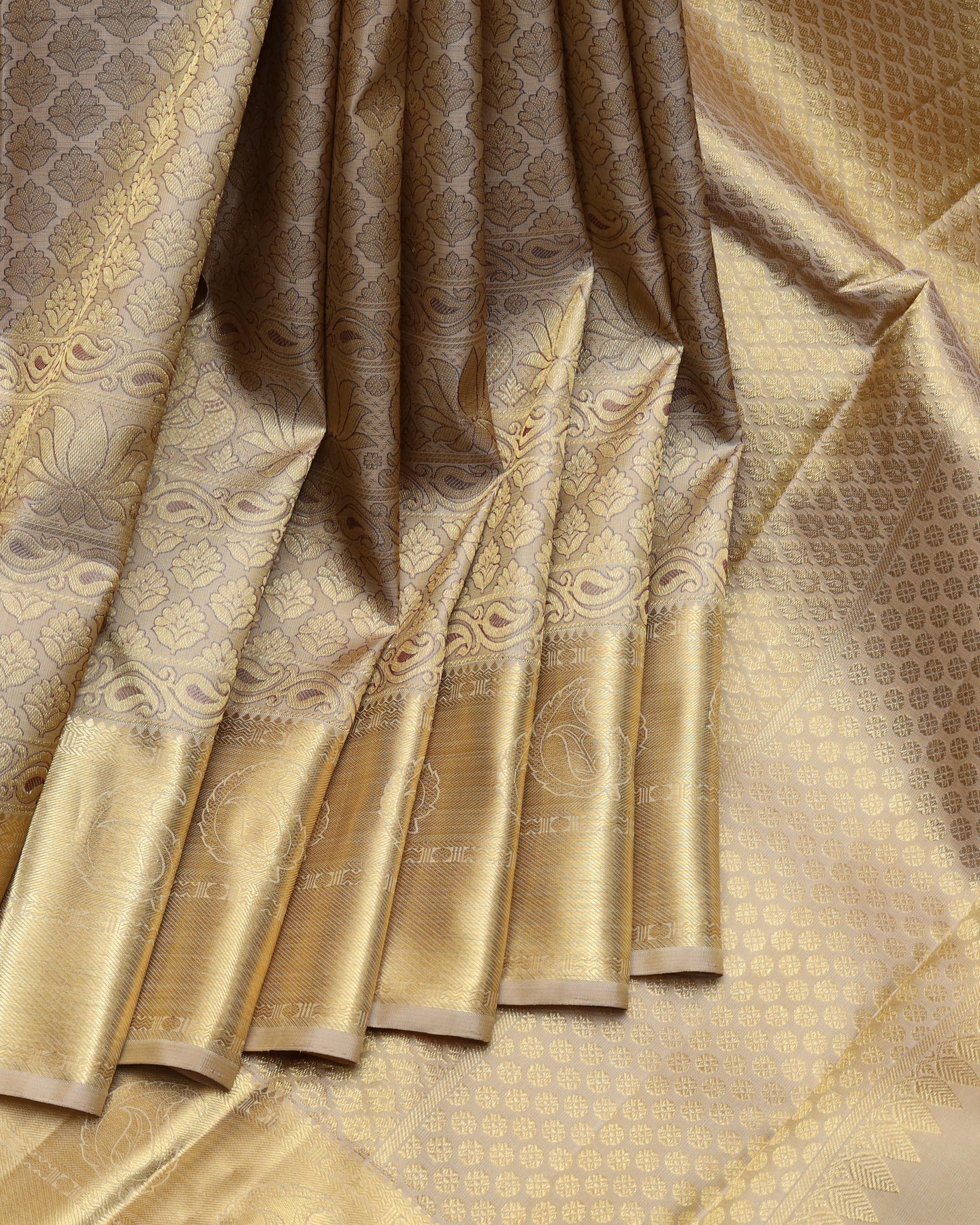 This is a graceful, champagne-gold kanchipuram silk saree, intricately woven with delicate zari work that showcases traditional floral and paisley motifs. The body features a refined, all-over jaal pattern with fine leaf designs, while the border and pallu are richly adorned with artistic, symmetrical detailing that includes lotus motifs and flowing vine patterns. The subtle sheen and muted elegance of the fabric make it a timeless choice for weddings, receptions, or grand festive occasions, exuding a sophisticated and regal charm.Blouse is shown in the last image
