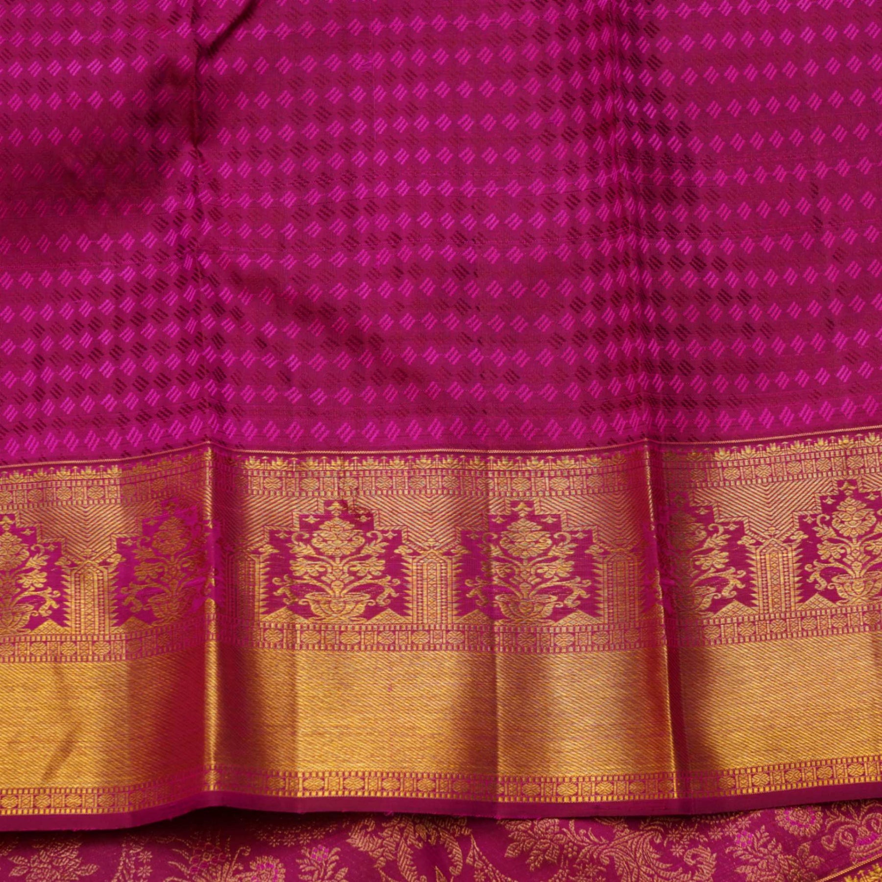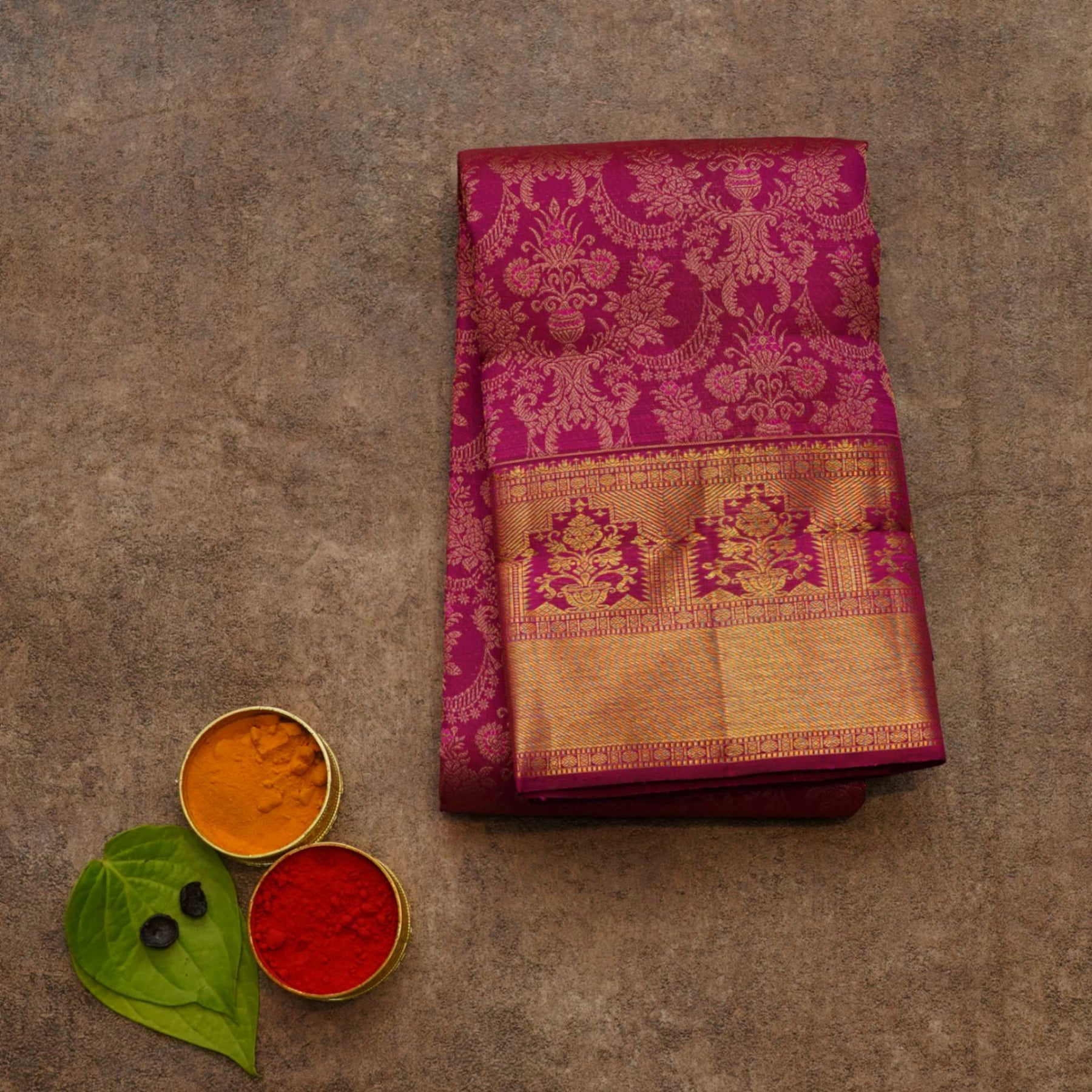 Reciting tales of regal enchantment, this gorgeous magenta pink silk saree is abloom with intricately designed gold zari floral jaal brocade. The majestic allure of this bridal weave is lent a timeless edge with a self gold zari brocade border with floral motifs.