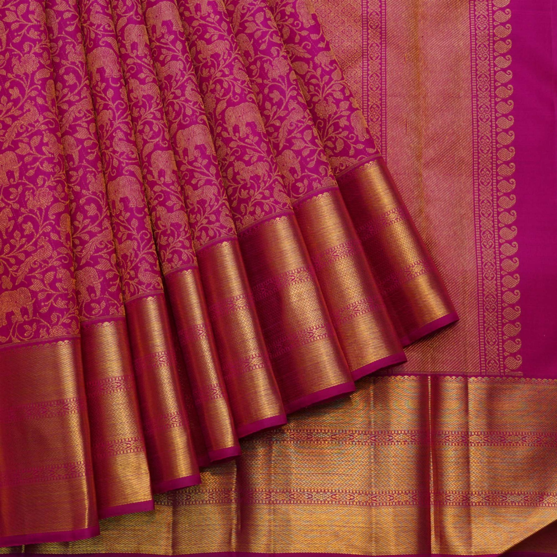 Exuding timeless charm, this beautiful pink vanasingaram silk saree showcases our heritage in all its glory. The intricate craftsmanship of the vanasingaram design is truly mesmerising and the pleasing hue of pink adds to the allure. The artistic weave is lent a timeless complement with a self gold zari brocade border with aesthetic accents.