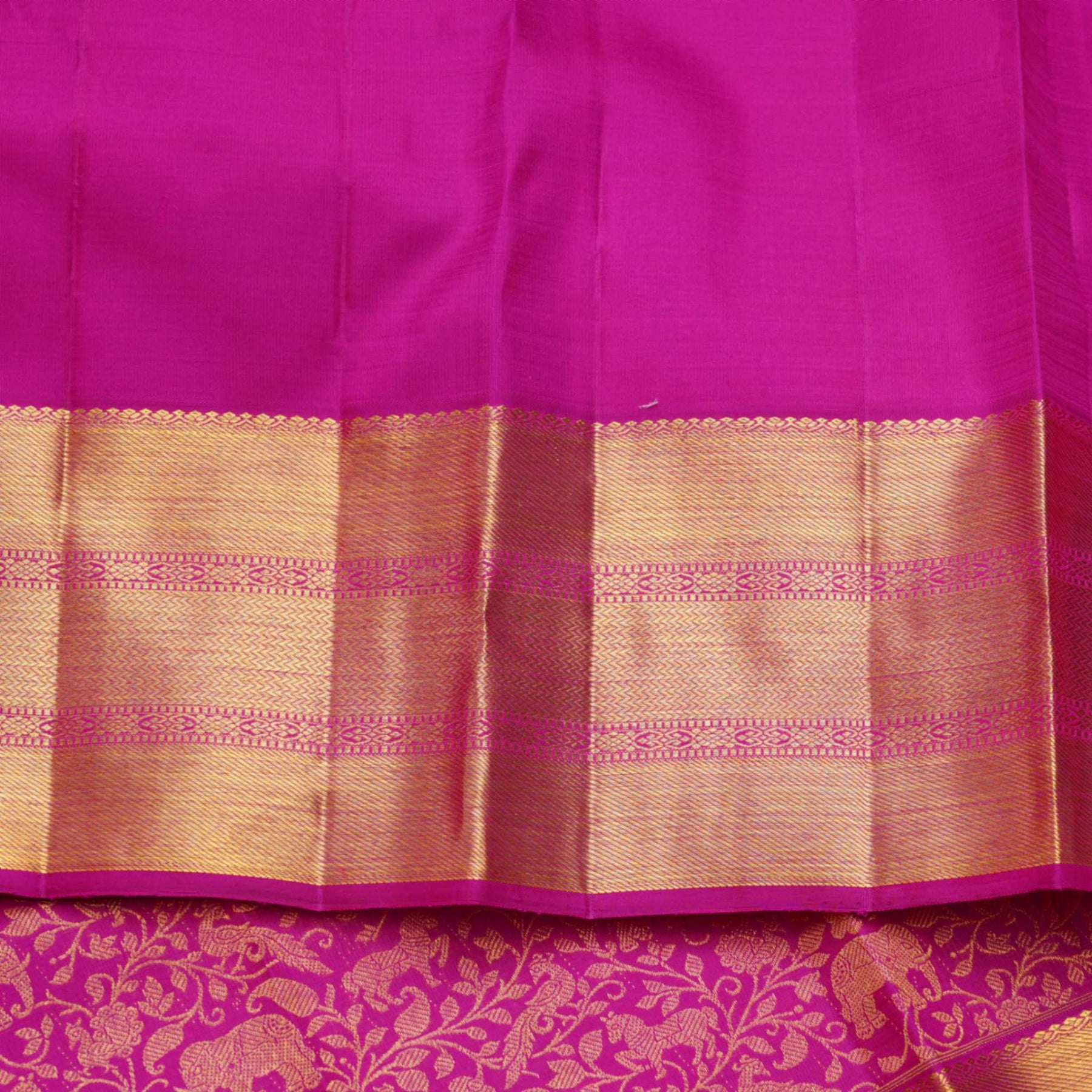 This strikingly pretty weave is accentuated with a self gold zari pallu with geometric brocade and aesthetic accents. The plain pink blouse with zari border adds to the classy allure of this bridal weave.