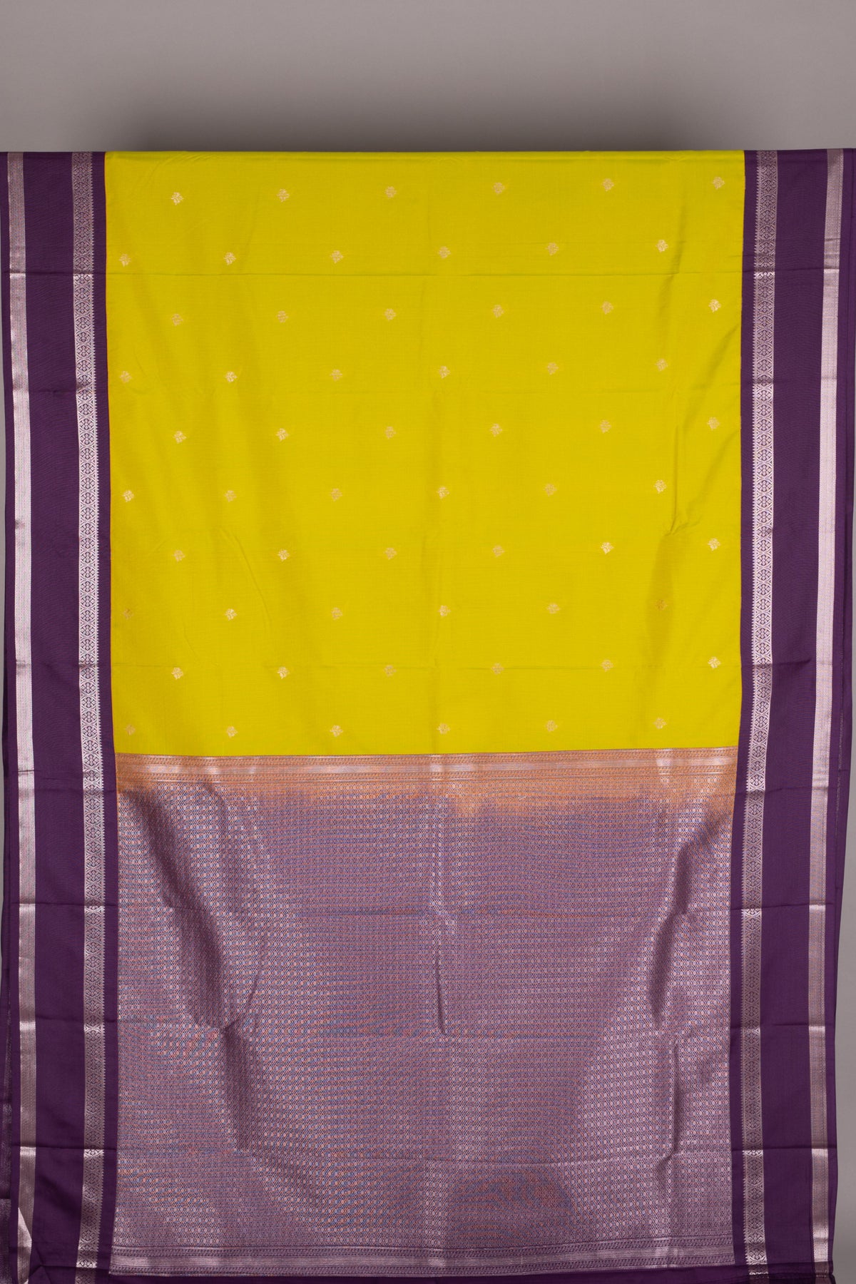 Bright, bold, and beautifully traditional this Green and Purple Semi-Silk Saree is a celebration of classic South Indian aesthetics. The vibrant lime green body is delicately adorned with small silver zari buttas, adding a subtle shimmer and charm to its minimal design.
