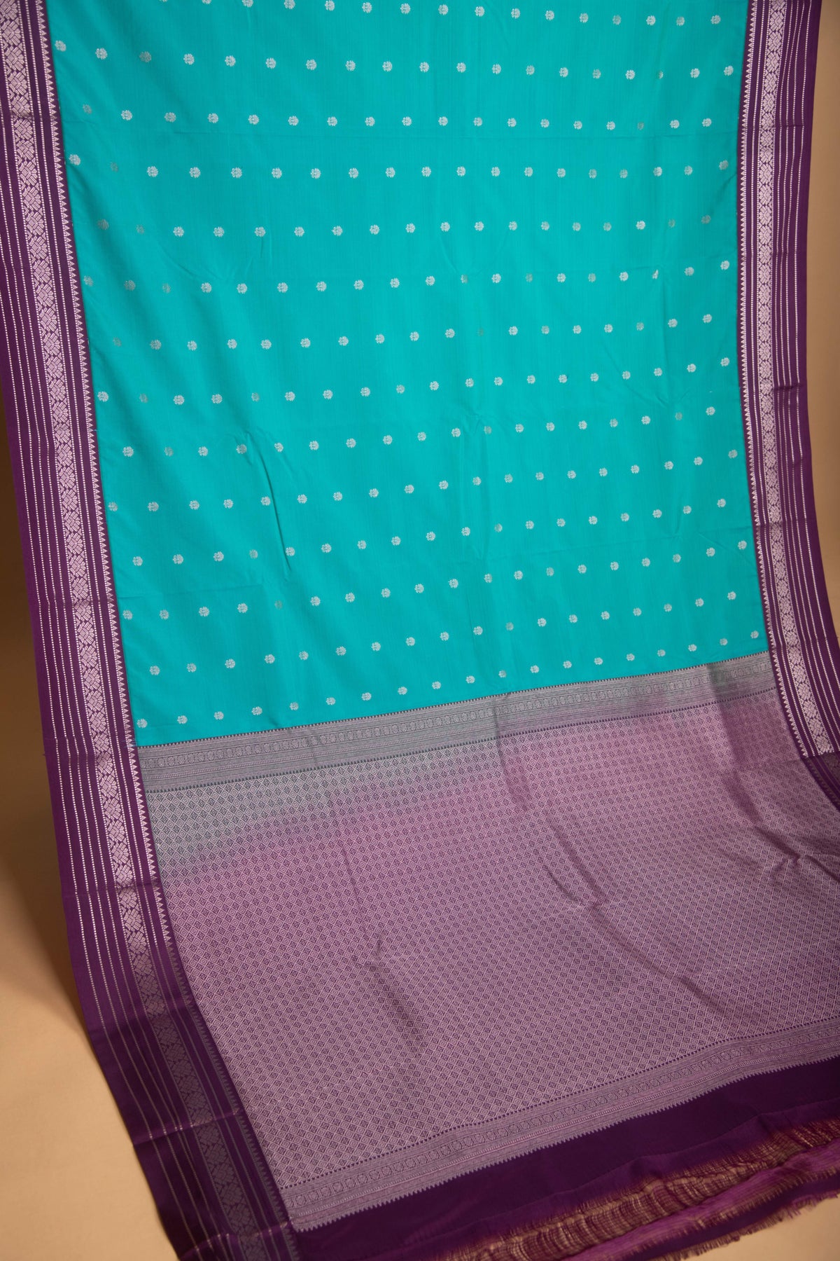 A brilliant Rama Blue base that provides a fresh and energetic backdrop.The Motifs: The body is meticulously peppered with silver zari floral buttis, lending a delicate shine and sophisticated texture to the fabric. The Border: A rich, contrasting Deep Purple border featuring traditional silver zari patterns and linear stripes, framing the saree with regal elegance. The Pallu: A magnificent solid purple pallu heavily embellished with intricate silver zari work in a dense, woven pattern that drapes beautifully over the shoulder. Last image shown is the blouse.