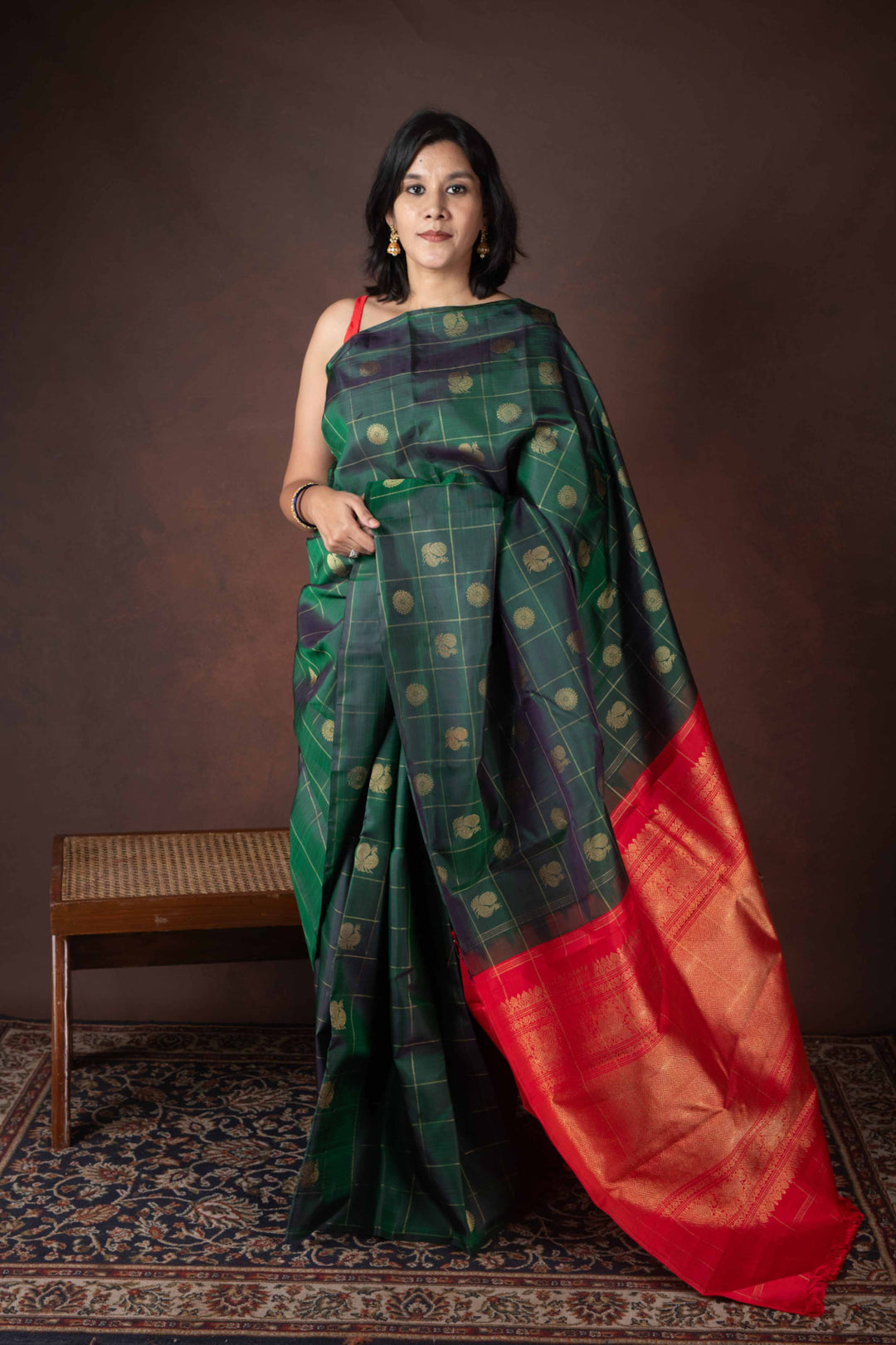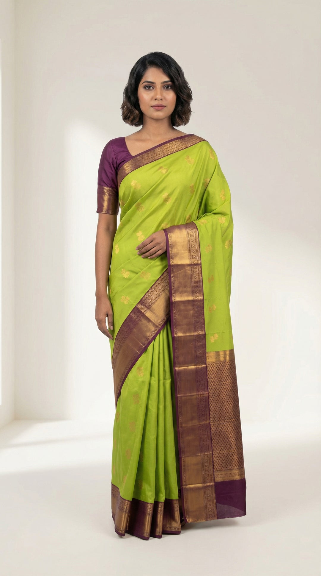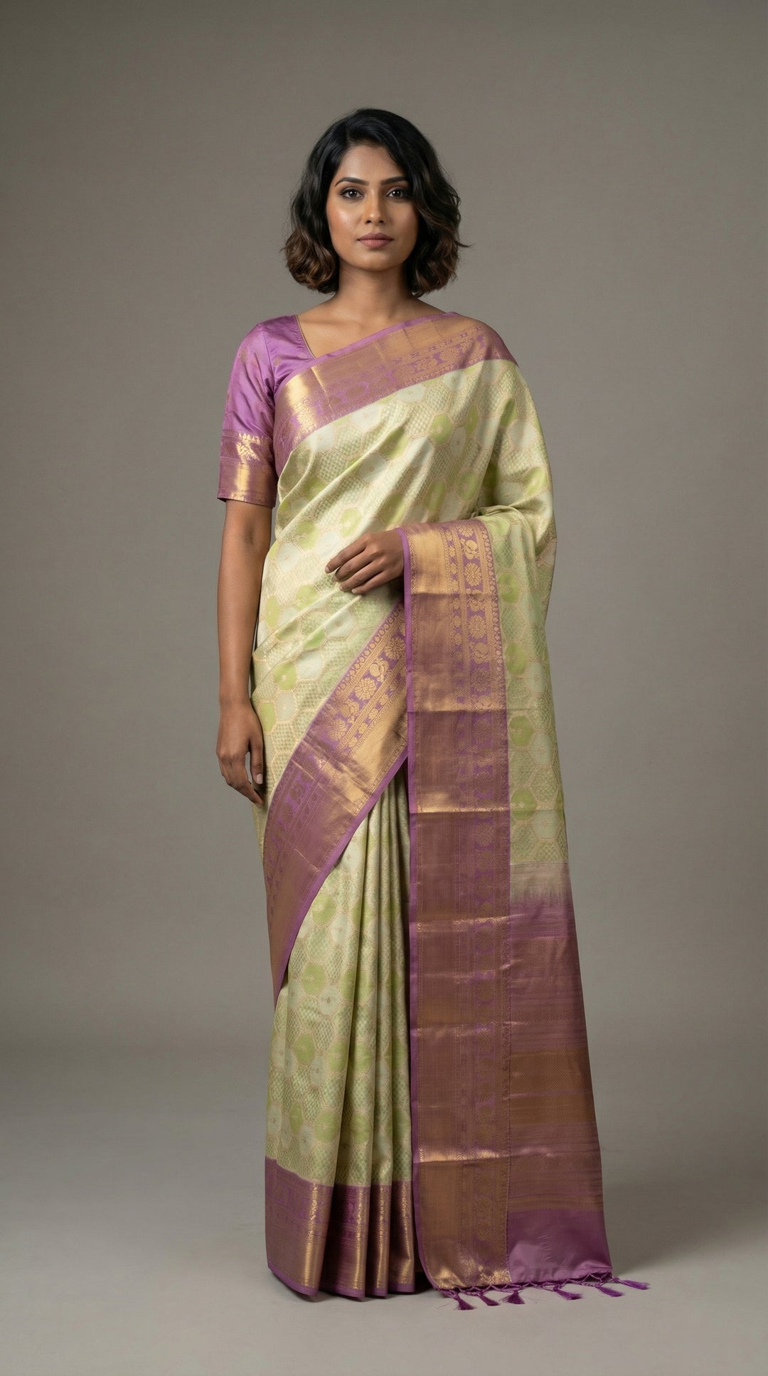 Step into elegance with our Green Kanchipuram Saree – a harmonious blend of tradition and grace. Crafted from luxurious mulberry silk, this saree showcases a stunning green palette that resonates with nature's beauty. The intricate zari work, inspired by temples and mythology, adds a touch of regality, making it an ideal choice for weddings and festive occasions. Embrace the enchanting allure of this Green Kanchipuram Saree, a symbol of timeless sophistication and a celebration of your unique style. Stand out with grace and radiance in this exquisite piece that captures the essence of tradition with a modern flair.