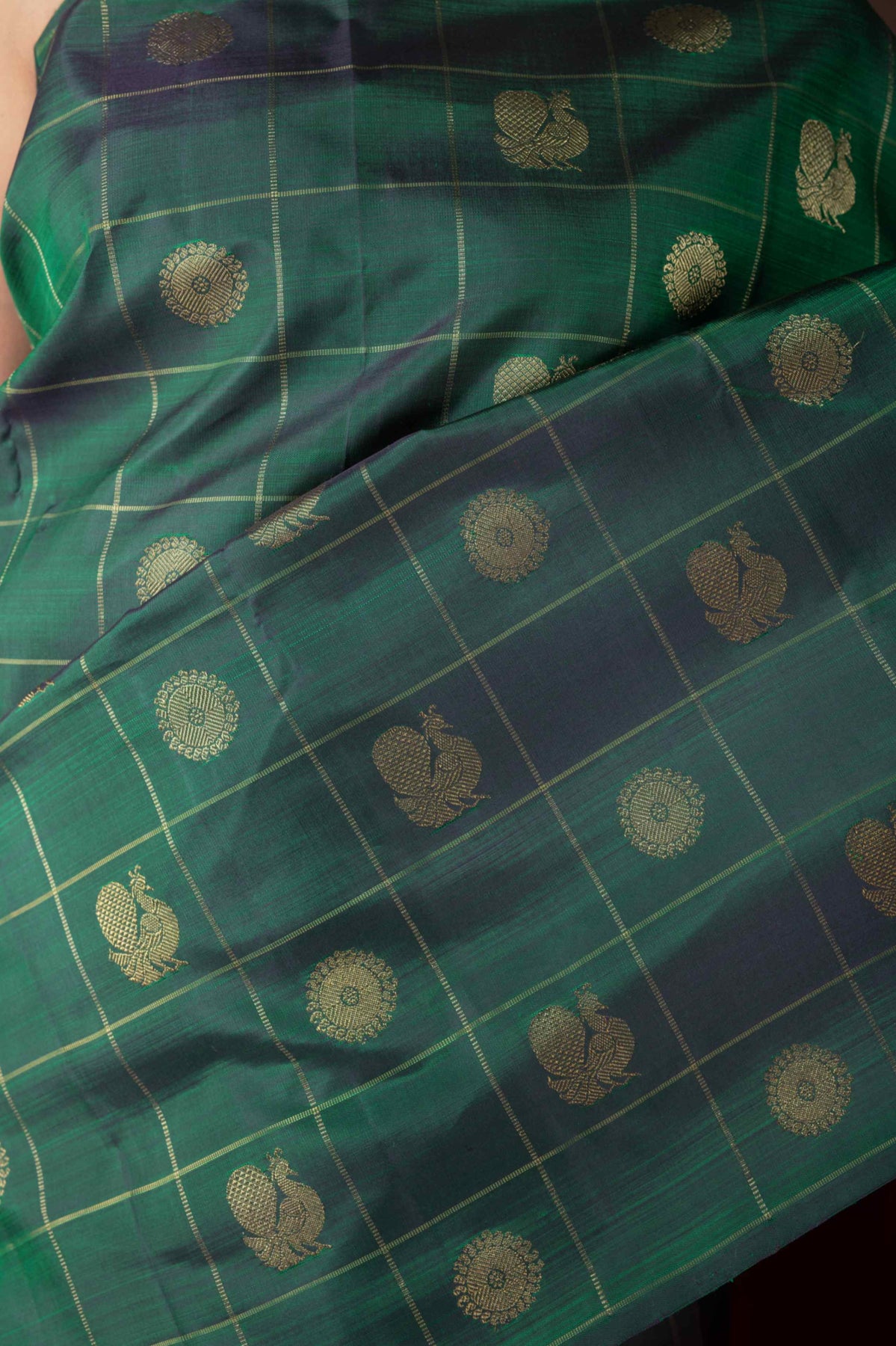 Green borderless pure kanchipuram silk saree is woven with zari checks filled with annam and chakram motifs with contrast red rich pallu and blouse. Blouse is shown in the last image