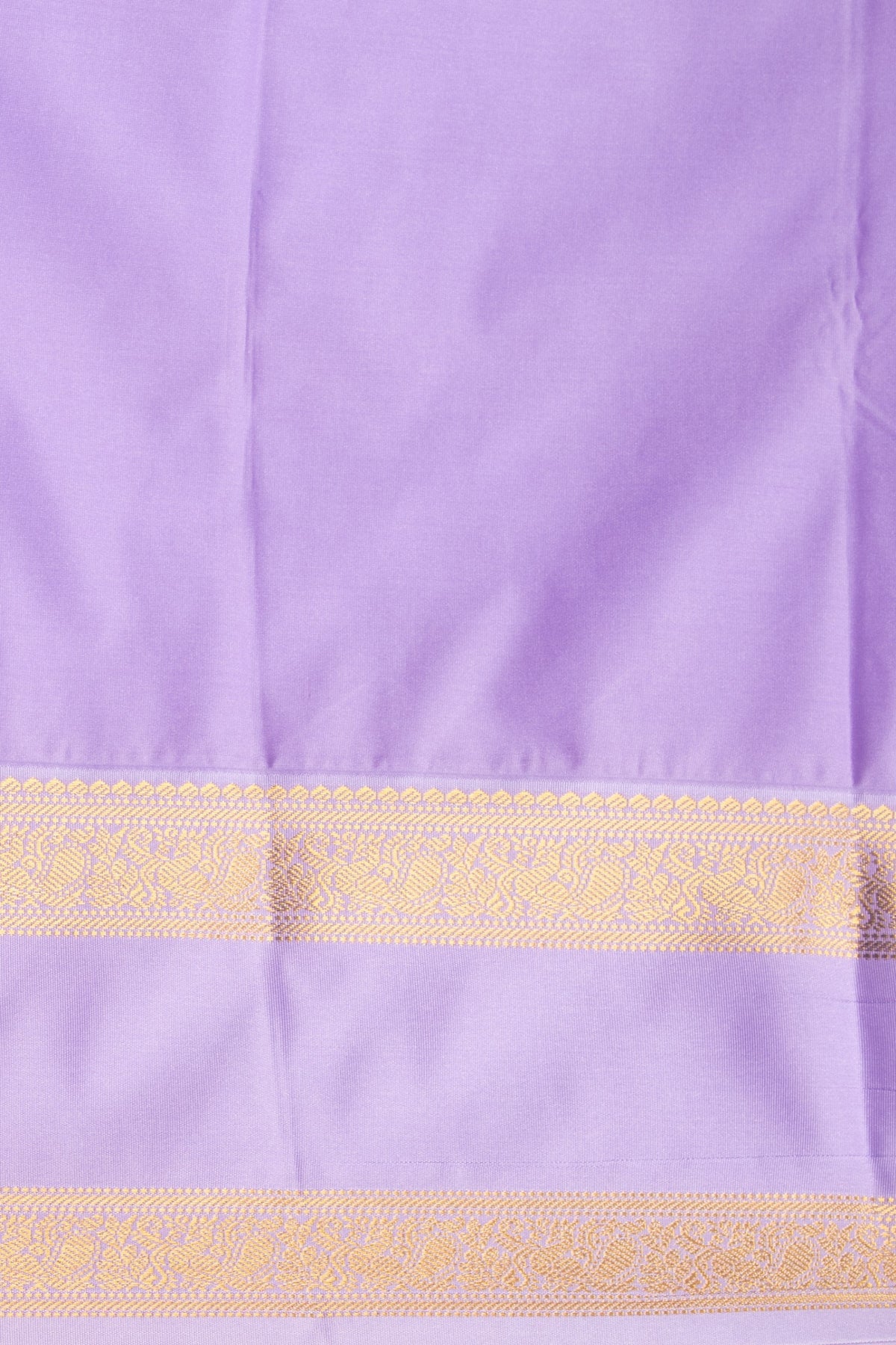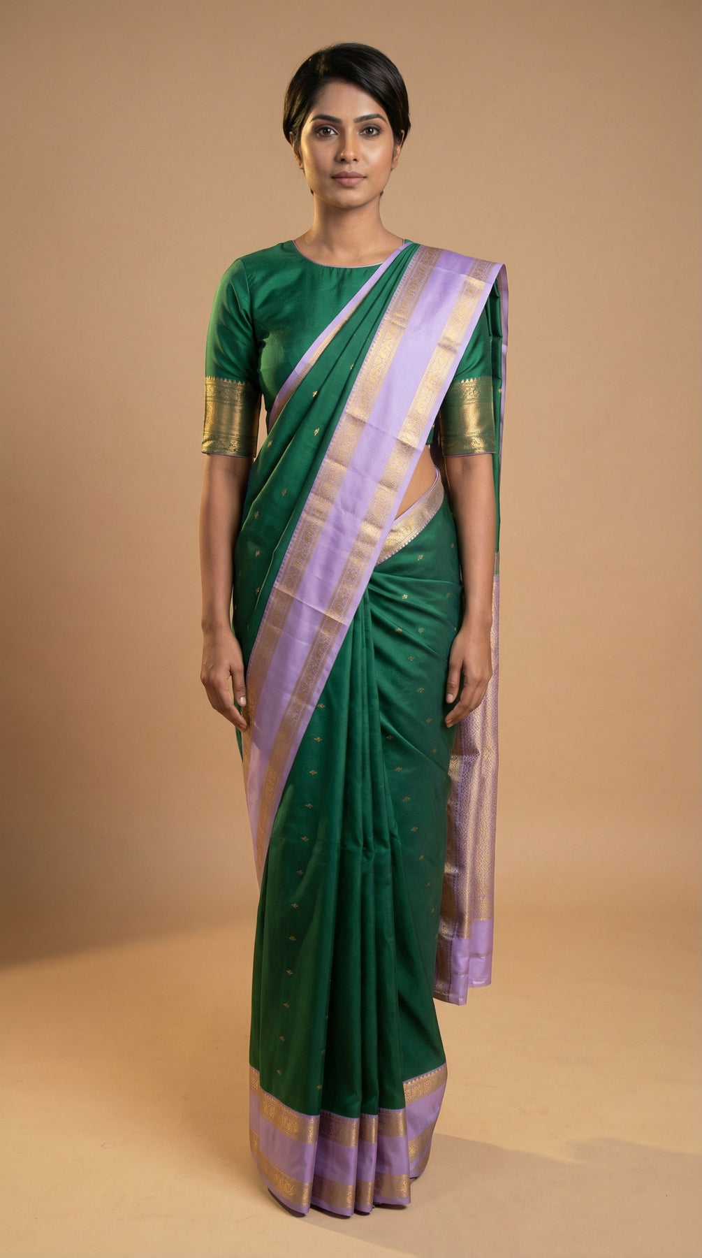 The rich green body is tastefully adorned with scattered Gold Zari buttas (motifs) in small, stylized shapes like dots or leaves. These delicate motifs are evenly spaced, adding a subtle sparkle and texture to the main field of the saree. Retta Patta Border: The border is defined by the classic Retta Patta (two-stripe) style, featuring parallel bands of shimmering Gold Zari that frame a solid band of the Lavender color. The outermost edge is often finished with a contrasting piping . The pallu is rendered in the light, luminous Pastel Lavender. It features a broad, textural band of fine Gold Zari weaving near the edge, providing a sophisticated, metallic contrast to the plain body. The overall effect is elegant and structured. Last image shown is the blouse.
