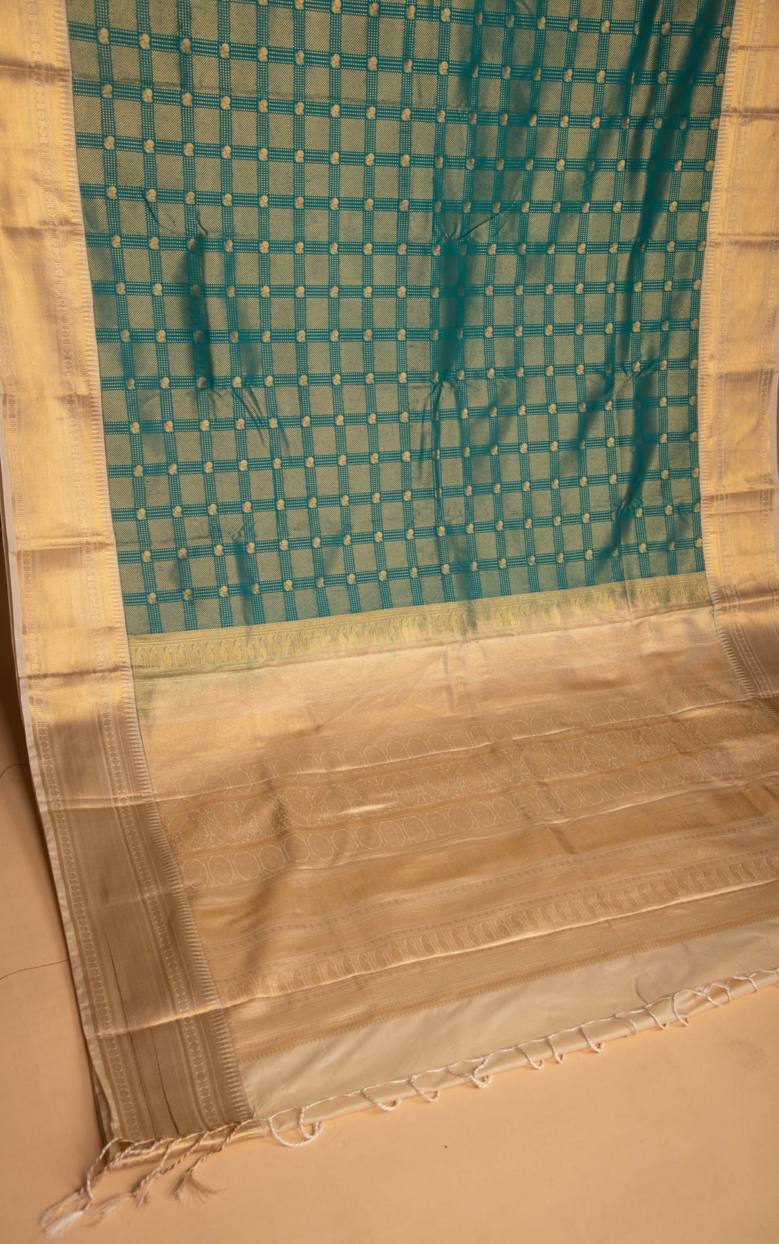 The Teal Green body is intricately woven with a fine square check pattern, with a subtle gold butta placed at the intersection of each square. This precise, all-over weaving technique gives the entire body a rich texture, dimension, and a beautiful metallic shimmer that complements the silk's fluid drape. The border is woven in a radiant Gold Zari, featuring traditional geometric or vine motifs, providing a perfect transition to the contrasting color. The pallu is the masterpiece, woven completely in the rich Off-White/Cream tone with dense, elaborate Gold Zari weaving. The design features broad bands of traditional motifs and large, stylized chakra or floral designs that create a magnificent, shimmering metallic look. Last image shown is the blouse.