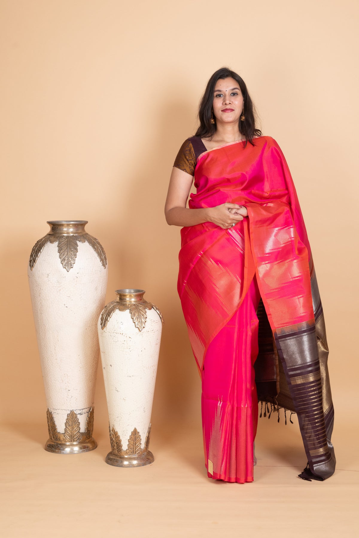 Graceful and contemporary, this Dual Tone Pink and Dates Brown Soft Silk Saree is a perfect blend of vibrance and elegance. The body shimmers with a striking dual-tone pink hue that exudes youthful charm, while the contrasting dates brown border and pallu add a rich, earthy sophistication. Minimal yet eye-catching zari accents enhance its drape, making it ideal for festive occasions, weddings, and elegant evening gatherings. Lightweight and luxurious, this soft silk saree beautifully balances tradition with modern appeal.