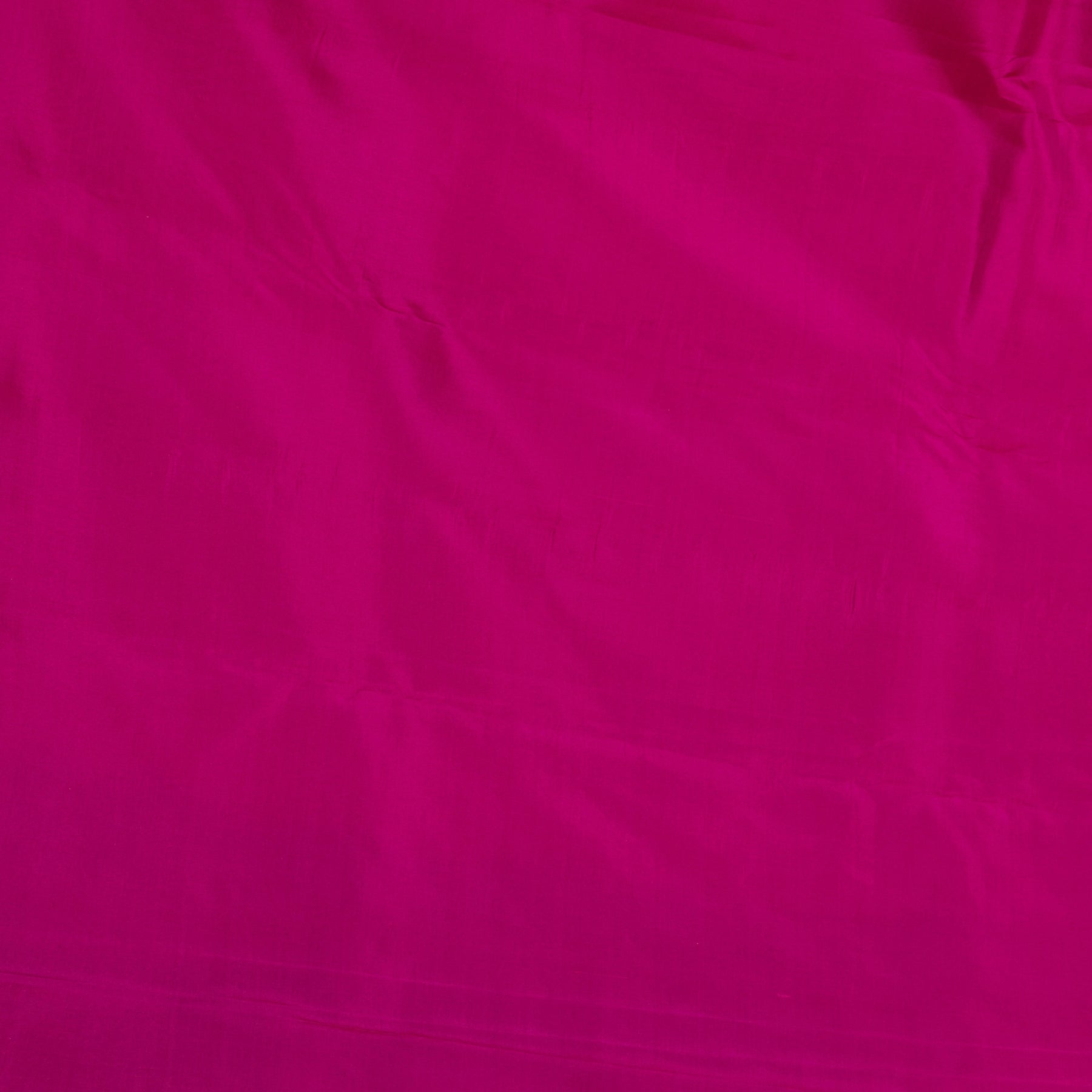 The Grape body features an overall shimmering, textured self-weave in a bronze-gold zari, creating a heavy, opulent look without the use of scattered motifs. The texture appears to be a chevron or striped pattern.The saree features a notable temple pattern where the two colors meet on the vertical edge, adding a classic, geometric touch to the dark Grape border.The broad Magenta section is densely woven with intricate all-over gold zari patterns (likely a diamond or floral mesh), giving the pallu significant weight and a festive sheen.