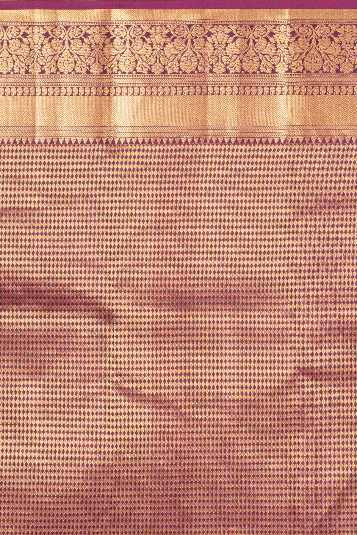 A deep, luminous Grape Purple forms the main body, offering a striking contrast to the rich, traditional Gold Zari work. The Grape Purple body is rich and smooth, possibly featuring small, scattered zari buttas (motifs) to add subtle sparkle. Wide, commanding borders are entirely covered in elaborate traditional zari patterns, providing an opulent, structured frame.The weighty pallu is the focal point, featuring solid bands and intricate geometric or floral designs in dense gold zari, ensuring a grand drape.