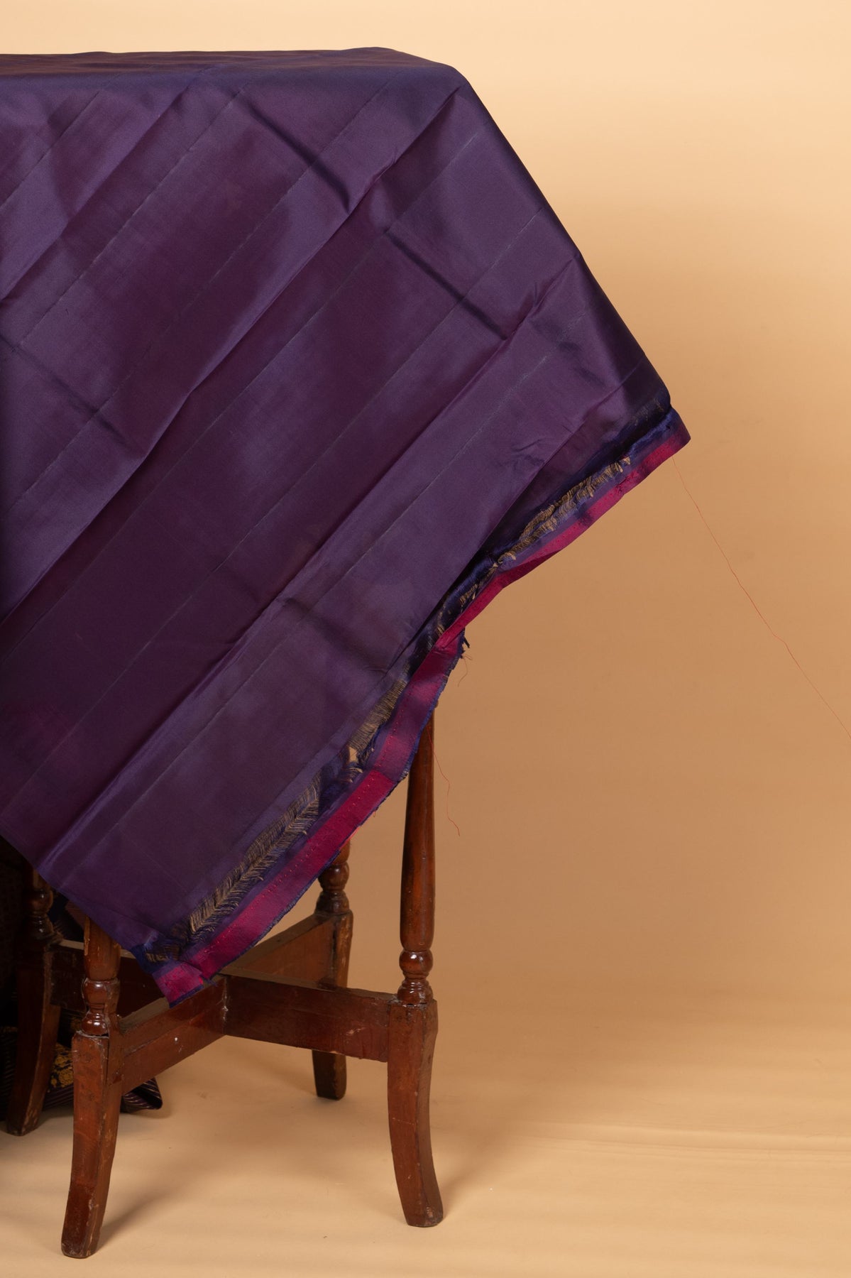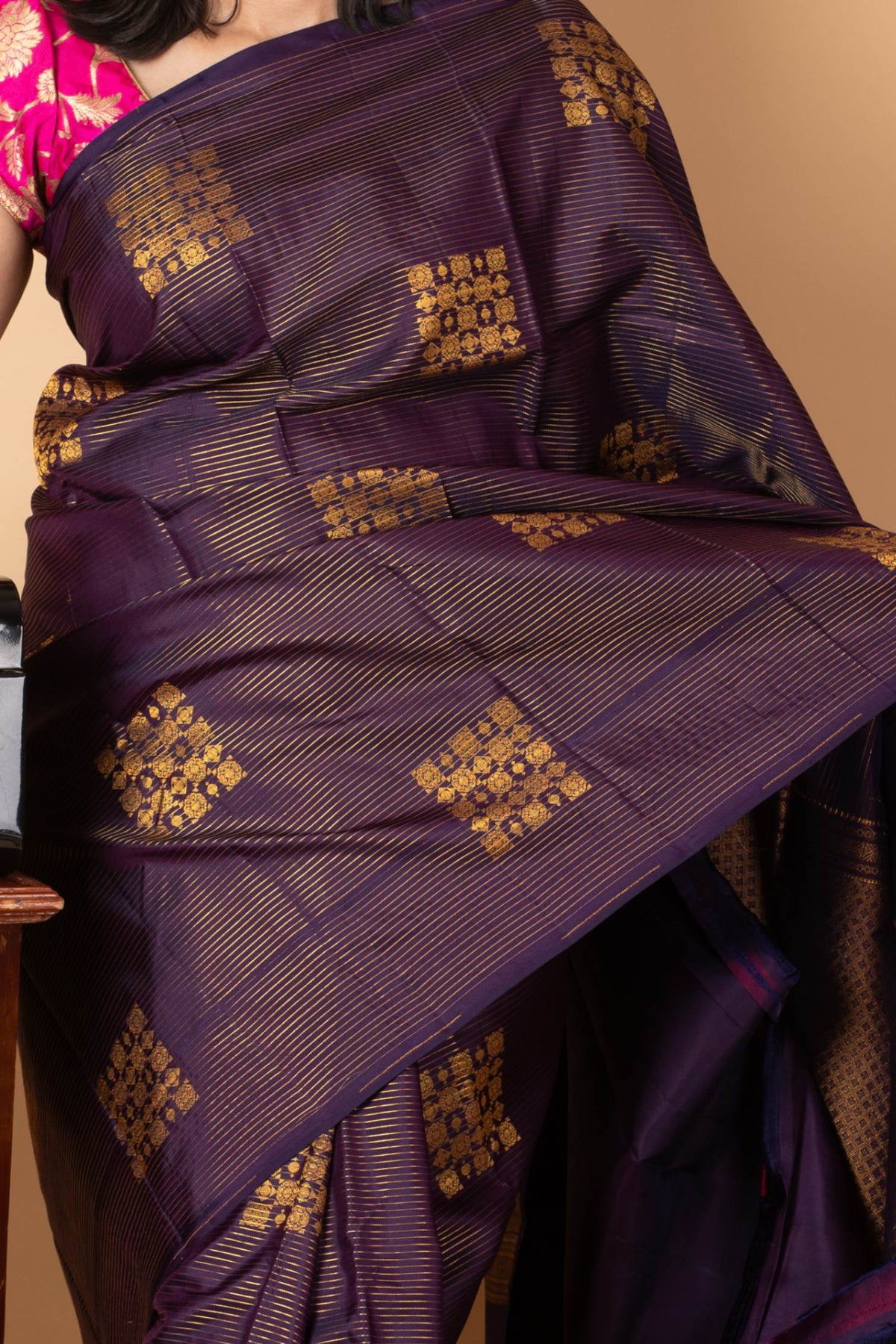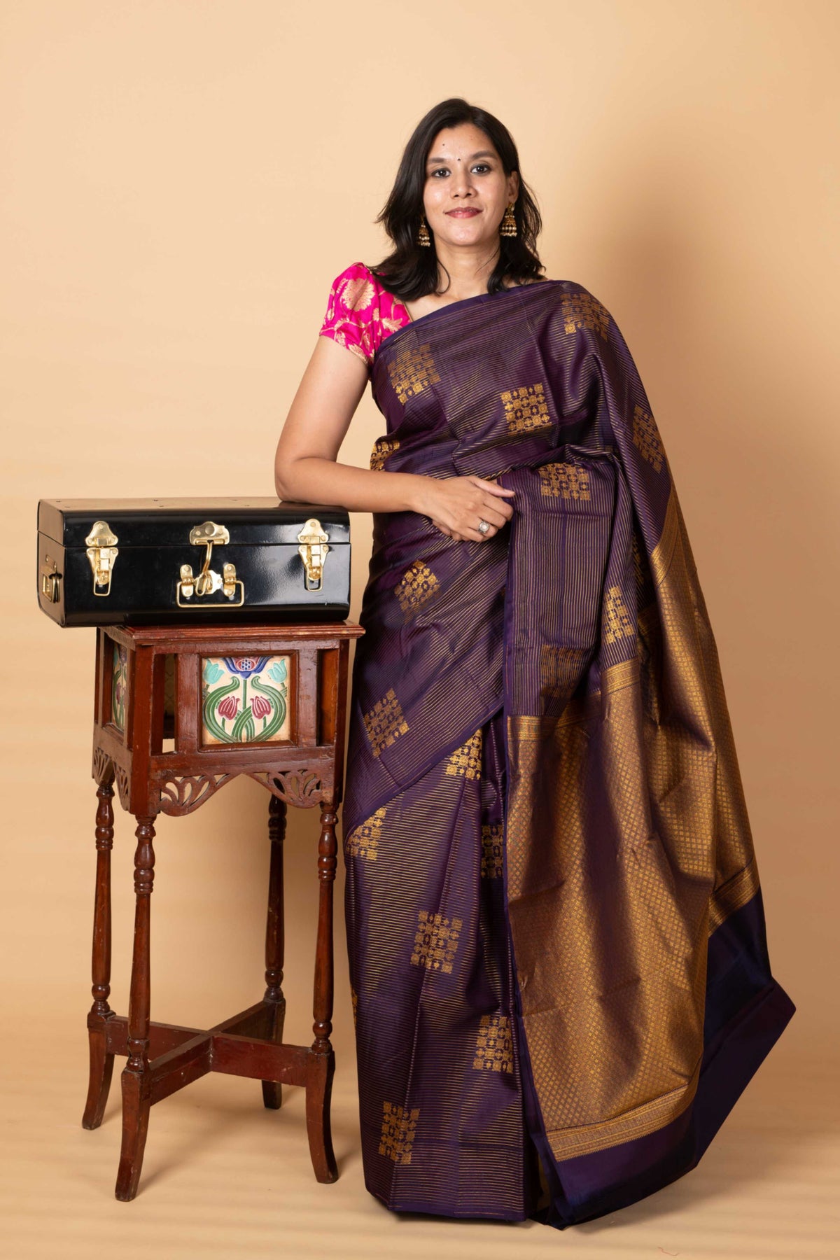 This saree is a deep royal purple silk piece, beautifully woven with intricate golden zari work. The body features narrow golden stripes with detailed square buttas, giving it a rich, structured appearance. The pallu stands out with dense, traditional zari weaving, adding a touch of grandeur and sophistication. The border complements the overall design with a subtle golden finish, enhancing the regal look. Paired with a contrasting pink blouse with golden zari motifs, this saree is perfect for weddings, grand celebrations, or formal traditional events.