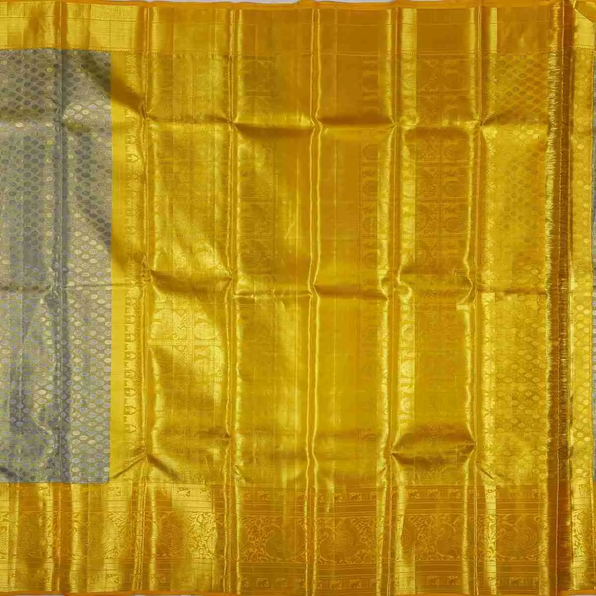 This silk flow edit from Kanchipuram silk brocade Greyish Yellow dual toned saree is an ethereal choice. It is beautifully sophisticated in golden chakra brocade across the Grey body, complemented with golden Yellow elephant in square boxed series on both the edges covering the anapakshi enjoying in a floral vineyard in the borders. The pallu is an amazing glance, extended with Yellow gold contrasting the Grey body in a series of annapakshi in square boxes across. A Yellow brocade blouse with golden zari border is attached.