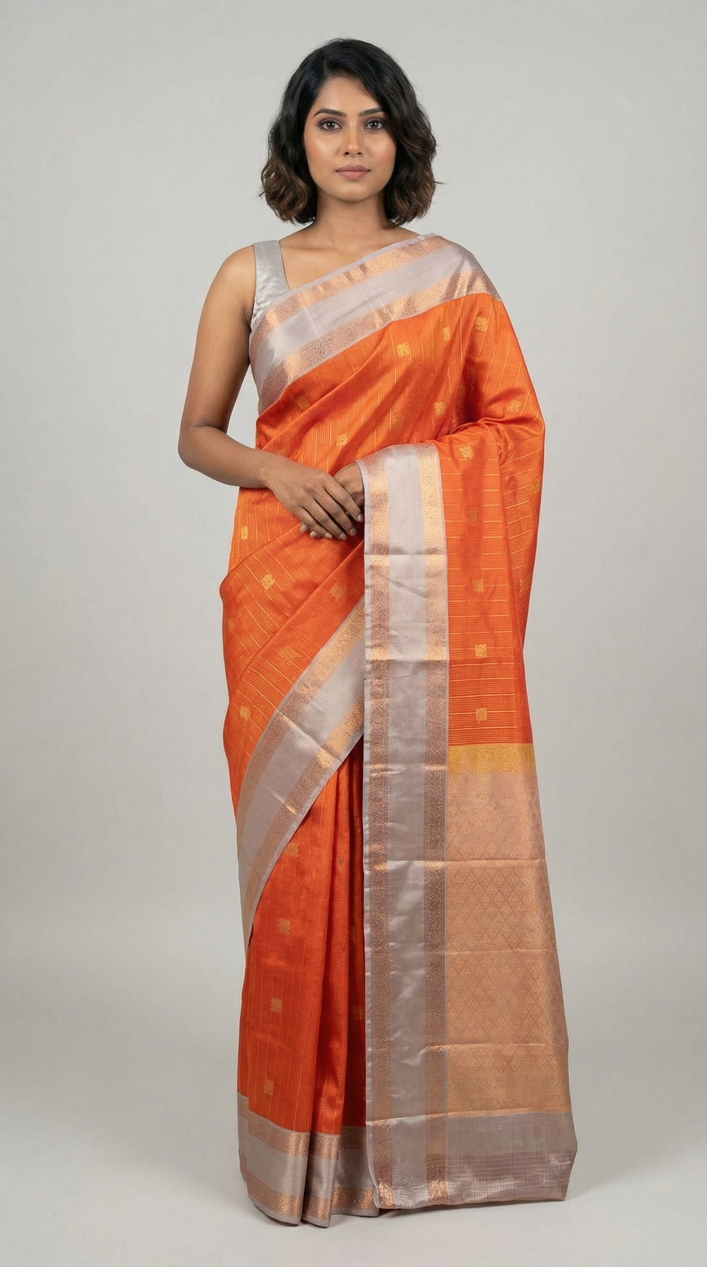 The body is a vibrant, cheerful Papaya Orange, beautifully contrasted by a sophisticated Cement Grey border and pallu. The Papaya Orange field features a subtle, fine pattern of woven lines known as Vairaoosi (Diamond Needle) checks. Within these checks, small, glowing gold-toned square motifs (buttas) are woven throughout, adding a gentle texture and shimmer. The border features an inner band of shimmering gold zari set against the grey ground, giving a muted, yet luxurious contrast.The pallu is the focal point, utilizing the grey base with a densely woven, fine geometric or diamond pattern in zari work.The clean, solid stripes of Cement Grey on the edges give the overall look a sharp, modern finish. Last image shown is the blouse.