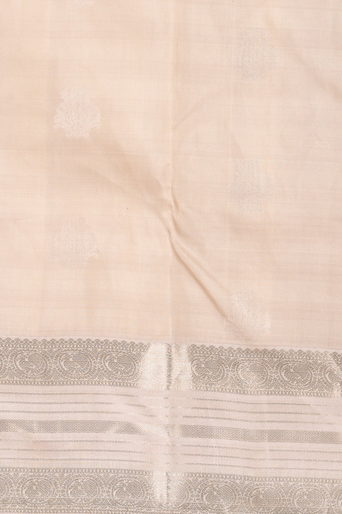 A deep, Bottle green silk base that offers a luxurious sheen and a slimming, graceful drape. The saree features the iconic "Retta Pattu" double-border design in a soft Dusky White, providing a distinct and grand structural look. The border and pallu are woven with premium zari that leans toward a sophisticated "Dusky White" or antique silver finish, making it stand out from standard gold weaves. The body is elegantly adorned with circular zari buttas, meticulously woven to add a rhythmic shimmer throughout the saree. A sharp, triangular temple motif connects the green body to the white border, a hallmark of authentic Korvai weaving techniques. Blouse worn by the model is for styling only last image shown is the actual blouse .