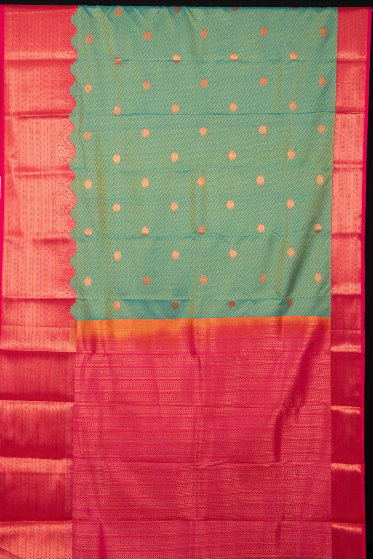 Dualtone green semi silk saree is woven with jaquard woven body and zari buttas with contrast korvai turning border, rich pallu and blouse.Blouse is shown in the last image