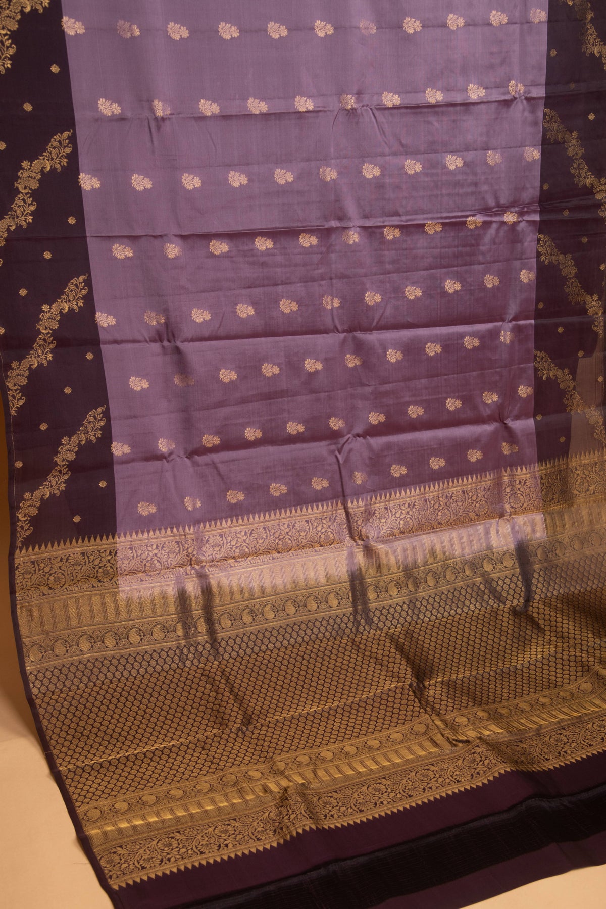 The central panel is a serene Purple Heart shade, meticulously adorned with delicate antique gold zari buttas that catch the light with a subtle shimmer. Flanking the main body are deep Blackberry Purple panels featuring diagonal floral vine (bel) motifs and micro-dots, adding a structured and contemporary designer touch . A wide, majestic border in Blackberry Purple, showcasing high-density Gold Zari weaving. It includes classic temple patterns and an intricate geometric lattice design.Grand Pallu: The pallu serves as a stunning focal point, heavily embellished with elaborate zari work that mirrors the intricate artistry of the border.Last image shown is the blouse.