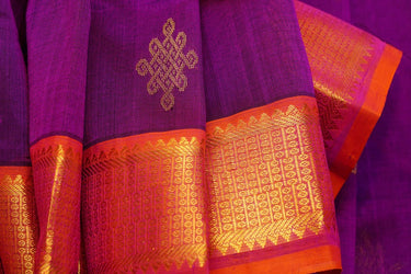 A rich, solid Violet body is dramatically contrasted with the shimmering, cool-toned Teal Green border and pallu.The magnificent, broad contrast border in Teal Green is densely woven with elegant silver zari. The shimmering border features intricate traditional patterns, creating a stunning glow against the...- Rs. 11,900.00