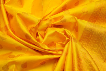 Pure Kanjivaram Silk, offering a splendid texture, a crisp fall, and a brilliant sheen that catches the light beautifully.The main field of the saree boasts a smooth, uniform weave, allowing the richness of the silk and the striking contrast borders to take center stage.- Rs. 11,900.00