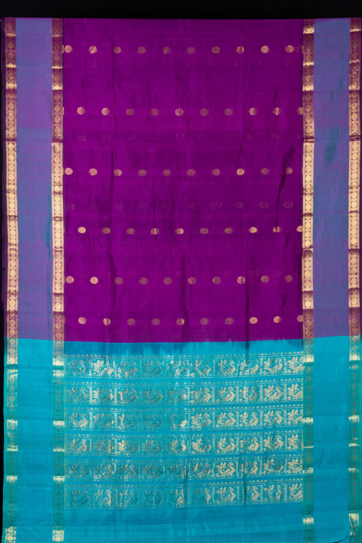 Purple body is adorned with rudraksham motifs throughout with retta pettu borders,rich contrast turquoise pallu and blouse.