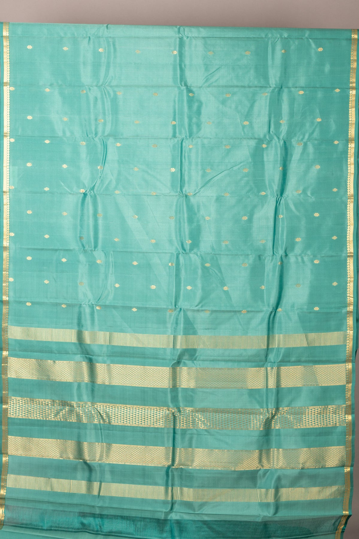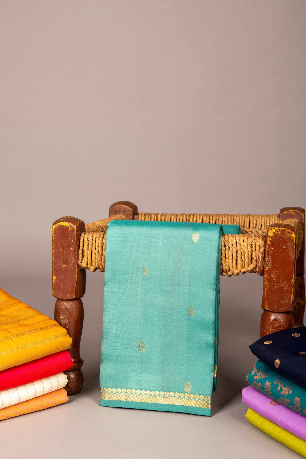 Step into timeless elegance with this stunning baby blue Kanchipuram silk saree, a true embodiment of South Indian craftsmanship and heritage. Woven from the finest silk, this saree offers a rich texture and an exquisite drape that reflects the grace and grandeur of traditional Kanchipuram weaves.The serene baby blue body is tastefully adorned with subtle golden zari buttas that add a refined shimmer without overpowering the look. The saree is bordered with a minimalist gold zari border, featuring traditional motifs and a sleek design that complements its overall understated elegance.