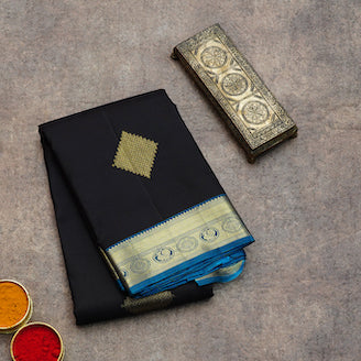 The rich black kanchi silk saree is weaved with traditional rangoli motifs all over the body and carries a contrast blue border with intricate zari design. The saree has a rich striking blue pallu and is paired with a contrast blue silk bloue.