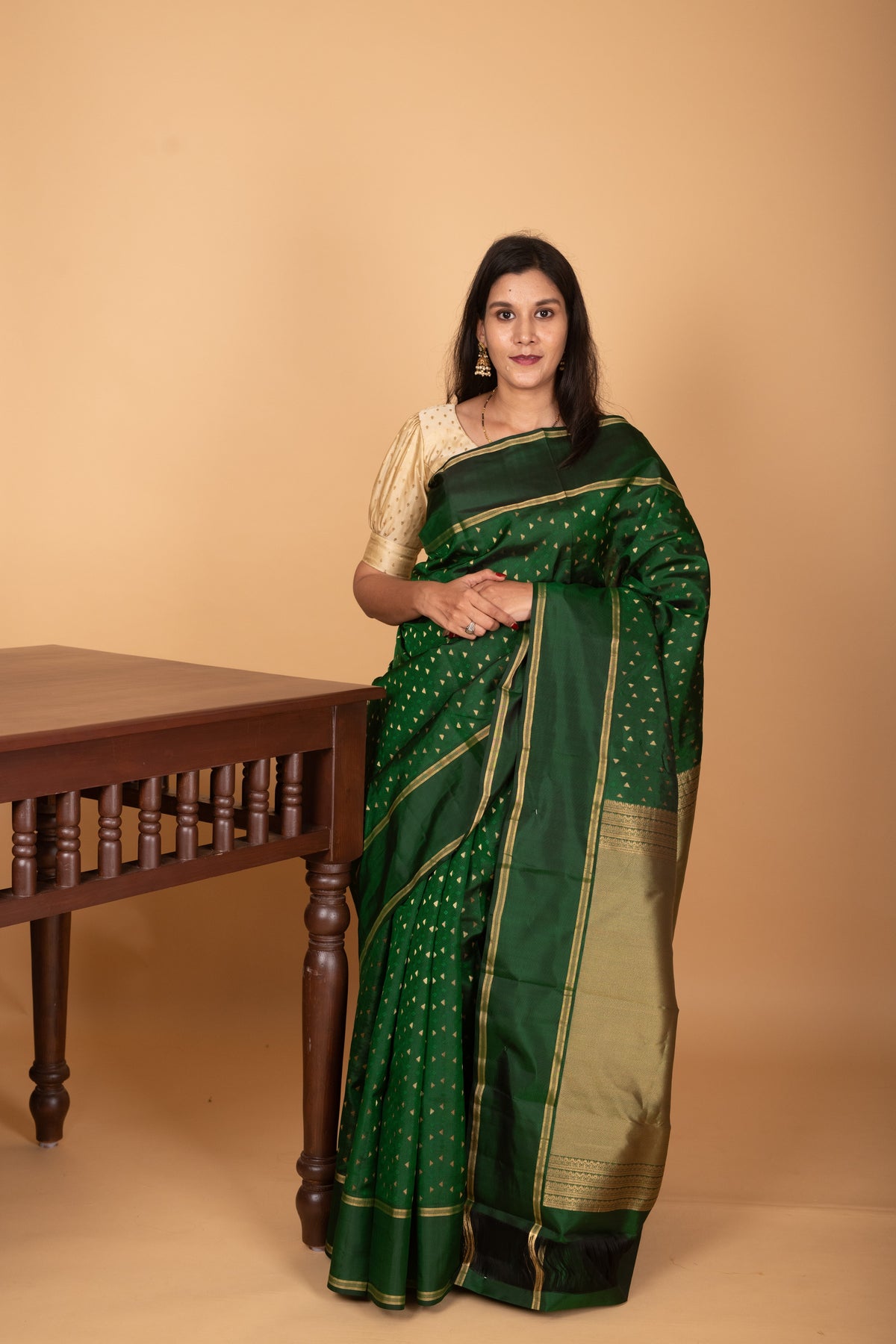 Intricate Golden Zari Buttas: The entire body is elegantly peppered with traditional golden zari micro-buttas, providing a rhythmic sparkle that catches the light with every movement.Sophisticated Zari Border: A medium-width border in a Forest Green tone features structured golden zari stripes and traditional woven patterns, providing a refined and classic frame.Opulent Grand Pallu: The saree concludes with a majestic Golden Zari Pallu, enriched with dense, traditional horizontal weaving that ensures a regal presence.Blouse worn by the model is for styling only last image shown is the actual blouse .