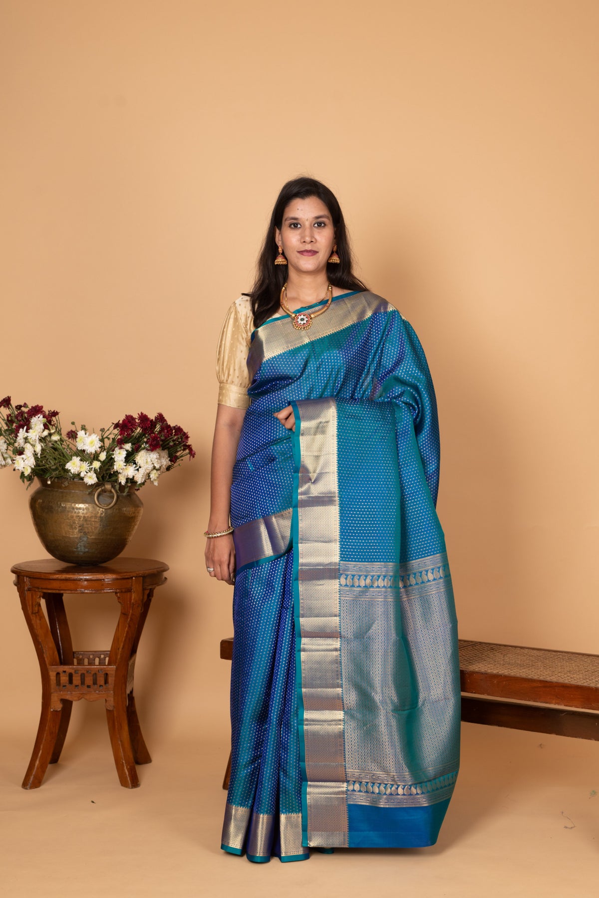 Dual-Tone Blue and Teal body that shifts between a vibrant Royal Blue and a deep Peacock Teal, giving it an oceanic depth and movement.Pure Kanjivaram Silk, celebrated for its luxurious feel, magnificent natural luster, and superior drape.The body is woven with small, intricate geometric buttis or motifs.The saree is beautifully bordered with a traditional temple-style edge and a generous pallu, both richly detailed with Bright Gold Zari work.
