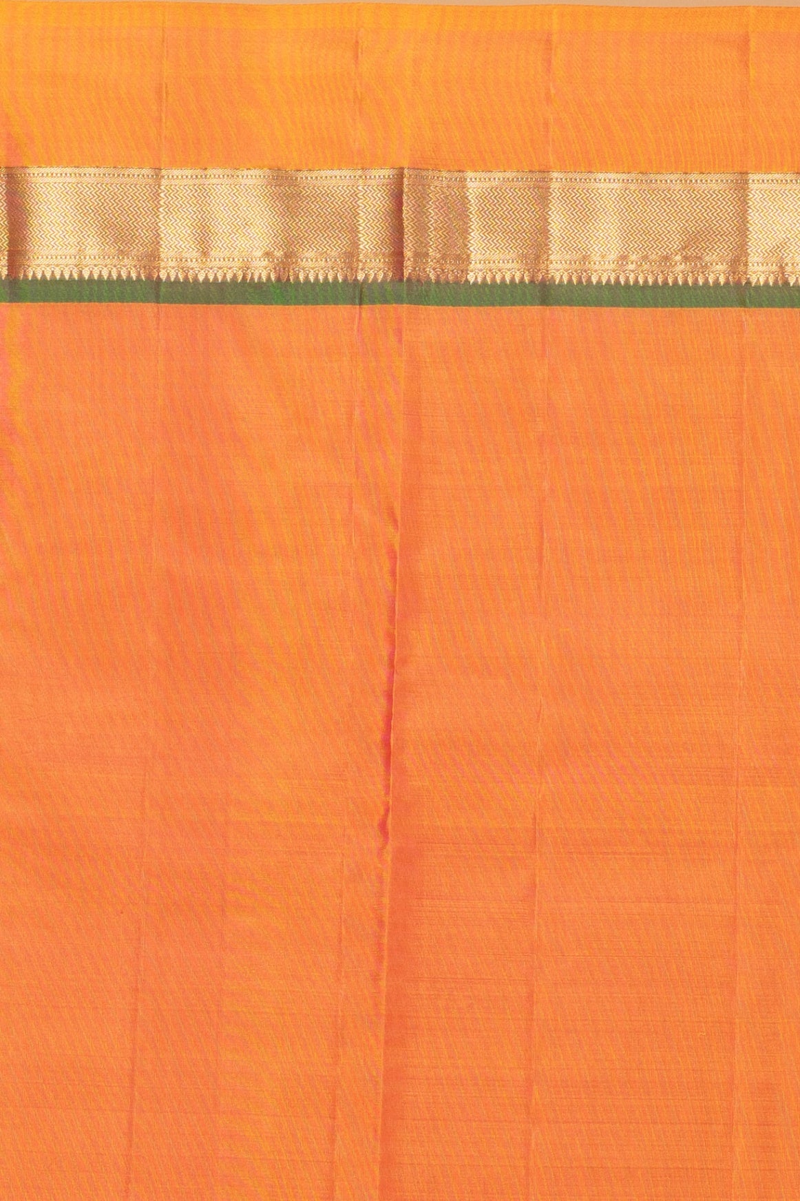 The saree features a classic, contrasting Zari border with fine stripes of color, including a sophisticated line of Green, which perfectly frames the warmer tones and adds a traditional South Indian touch. The pallu is woven with rich, fine Zari in traditional patterns, giving it a heavy, luxurious shimmer that contrasts with the simple, elegant body.This bright, radiant combination of colors is highly auspicious and makes the saree an ideal choice for bridal parties, puja ceremonies, and major festivals.