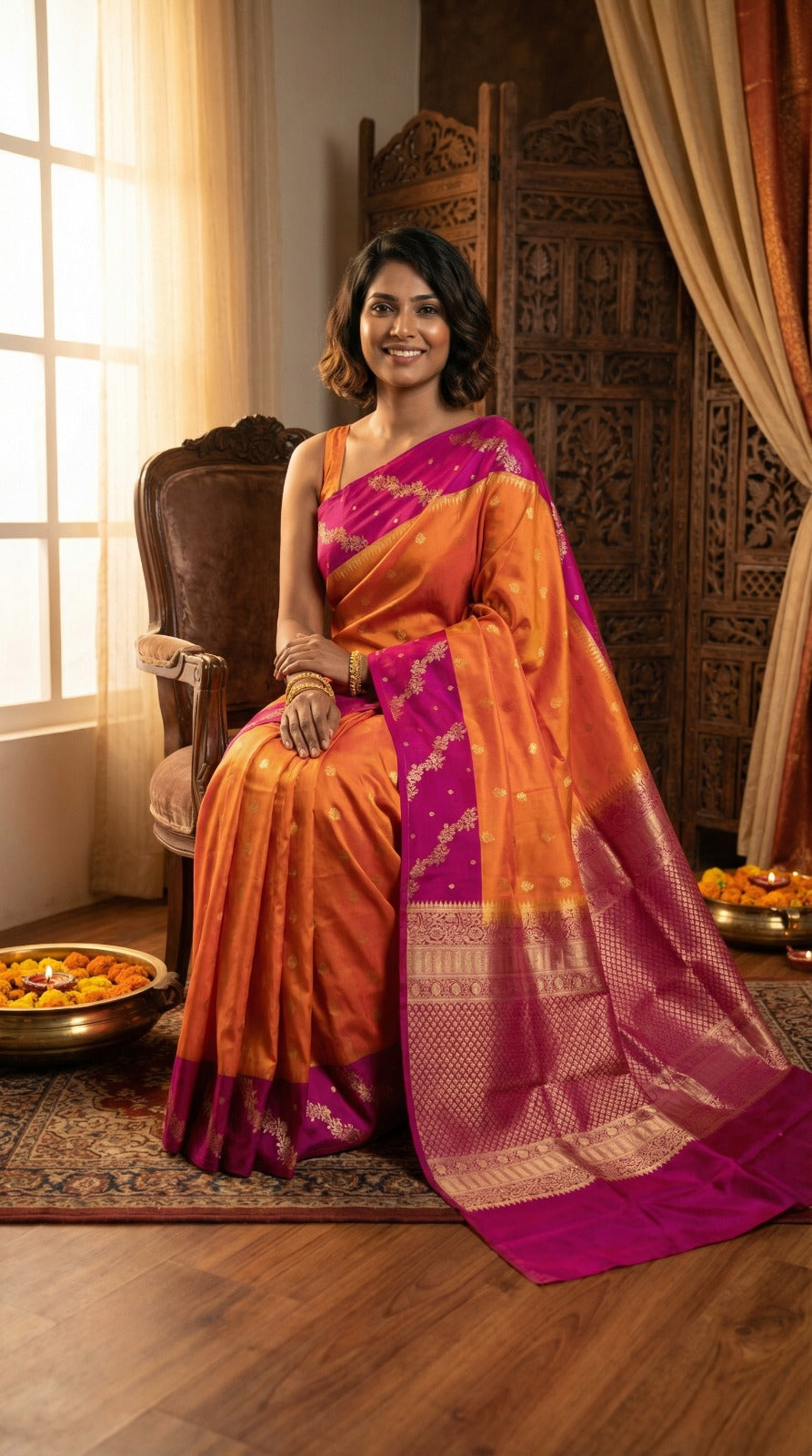 A brilliant Dual Tone Orange base that catches the light with golden undertones. It is adorned with rows of delicate gold zari florets (buttas) woven throughout the center. A grand, wide border in rich Magenta-Purple, featuring a dense Gold Zari weave. The design includes traditional temple patterns and intricate geometric honeycomb motifs. The heavy zari-woven pallu serves as a majestic extension of the border, showcasing elaborate craftsmanship and a rich texture that adds weight and grace to the drape. Last image shown is the blouse.